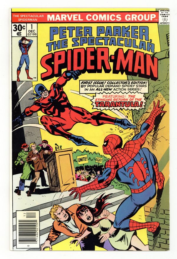 "Twice Stings The Tarantula!" Part 1 of 3. Script by Gerry Conway. Pencils by Sal Buscema. Inks by Mike Esposito. Cover by Sal Buscema and John Romita. The first issue of a brand new series for Spider-Man! The story opens with a bang as the Tarantula kidnaps the Empire State University vice-chancellor, despite the best efforts of the web-slinger, Flash Thompson, and Mary Jane Watson! Next, the Tarantula tries to kill the mayor, but this time the Spectacular Spider-Man is ready! Can the wall-crawler beat the Tarantula and save Mayor Abe Beame? First appearance of Edward Lansky (aka Lightmaster). (Notes: The Spectacular Spider-Man series became the third monthly title for Spider-Man. The first issue of the series debuted the same month as Amazing Spider-Man 163 and Marvel Team-Up 52. The letters page contains an essay from Gerry Conway describing the plans for the new Spider-Man title.) 32 pages Cover price $0.30.