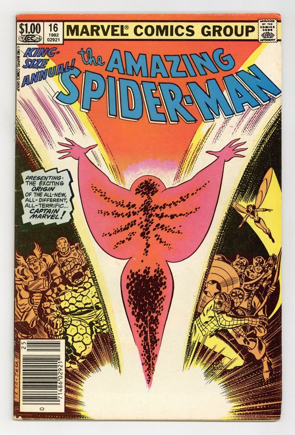 Direct Edition. "Who's That Lady?" First appearance of the second Captain Marvel, Monica Rambeau. Guest-starring the Avengers and the Thing. Script by Roger Stern. Art by John Romita Jr. (breakdowns) and John Romita Sr. (finishes). Cover by John Romita Jr. and John Romita Sr. It's the dazzling debut of the new Captain Marvel (aka Monica Rambeau)! After gaining her powers in a freak accident on an offshore oil rig, the New Orleans native needs help controlling her awesome new abilities! Monica travels to New York City in hopes of finding the Fantastic Four! But she bumps into the Spectacular Spider-Man first! After eluding the web-slinger, Captain Marvel zooms to the Baxter Building! However, Ben Grimm can only offer moral support, so he sends the distressed captain to Avengers Mansion! Once there Shell-head and the Wasp attempt to stabilize Captain Marvel's runaway powers, but the wall-crawler inadvertently interferes! Is the new Captain Marvel's superhero career going to be over...before it even starts? Cameo appearances by Harry Osborn and Liz (Allan) Osborn. Avengers Lineup: Captain America, Hawkeye, Iron Man, She-Hulk, Thor, and the Wasp. First backup feature: "The Many Loves of Peter Parker" One-page breakdown of the various loves of Peter Parker's life. Second backup feature: "The Daily Bugle" One-page illustration of the cast of characters at the Daily Bugle. (Note: Captain Marvel appears next in Avengers 227.) 52 pages. Cover price $1.00.