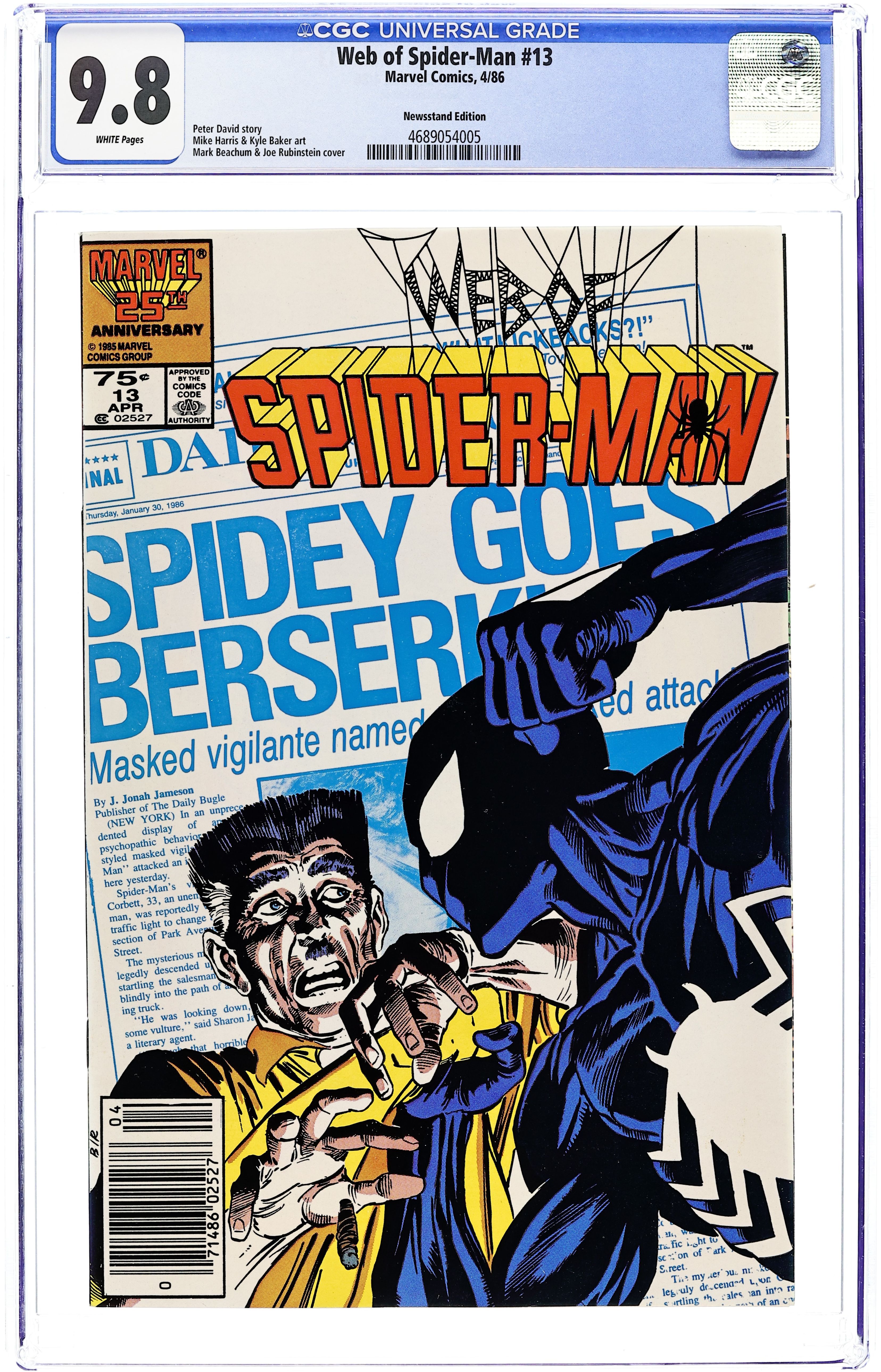 Newsstand Edition. "Point of View" Story by Peter David. Art by Mike Harris and Kyle Baker. Cover by Mark Beachum and Josef Rubinstein. J. Jonah Jameson spins a minor auto-pedestrian accident into another major anti-Spider-Man campaign. The web-slinger has had enough, and a powerful confrontation between Spider-Man and Jonah takes place! 32 pages $0.75. Cover price $0.75.