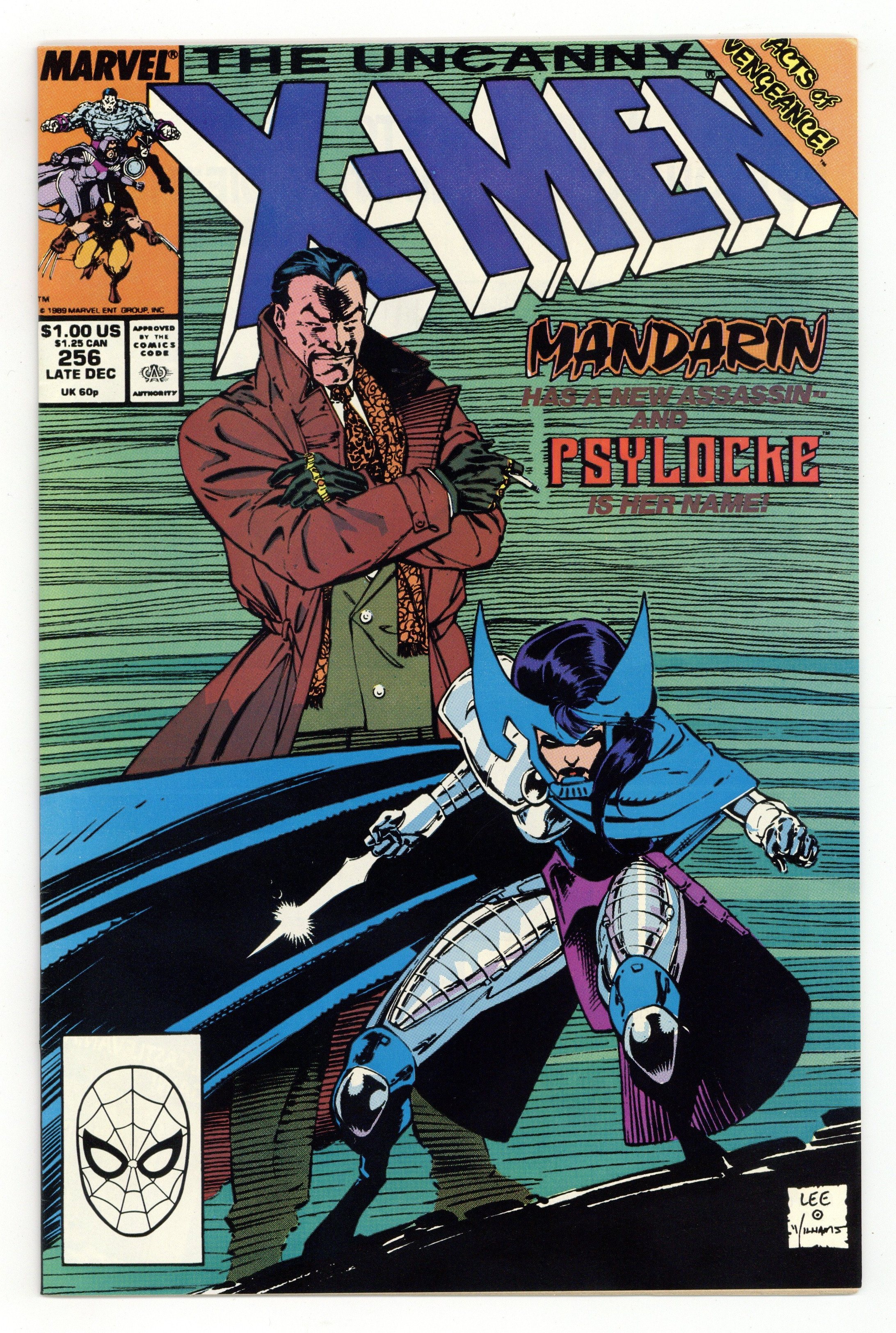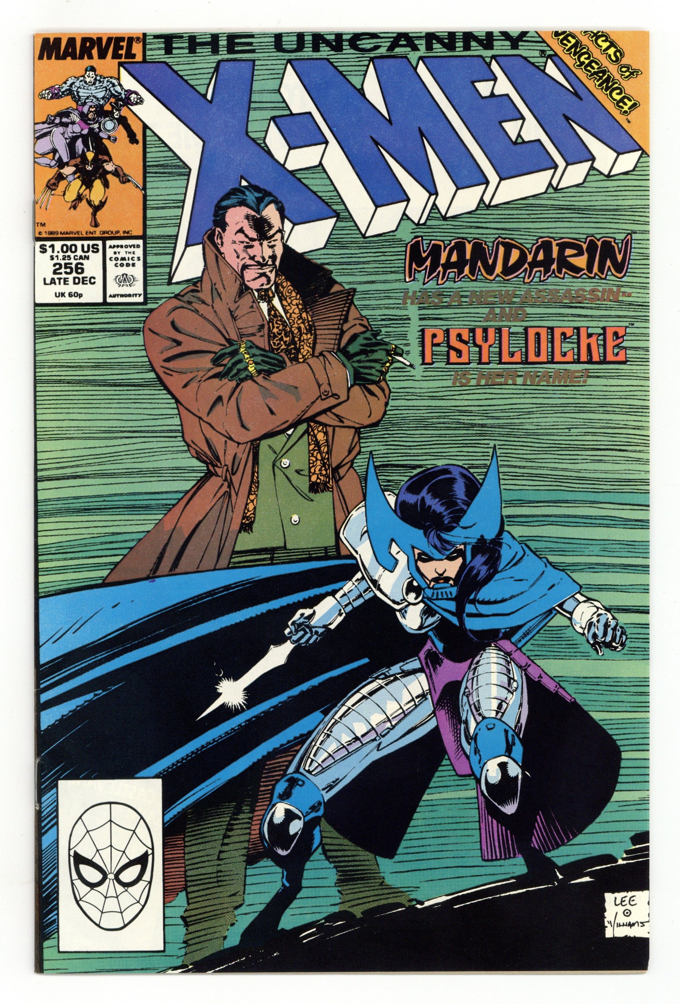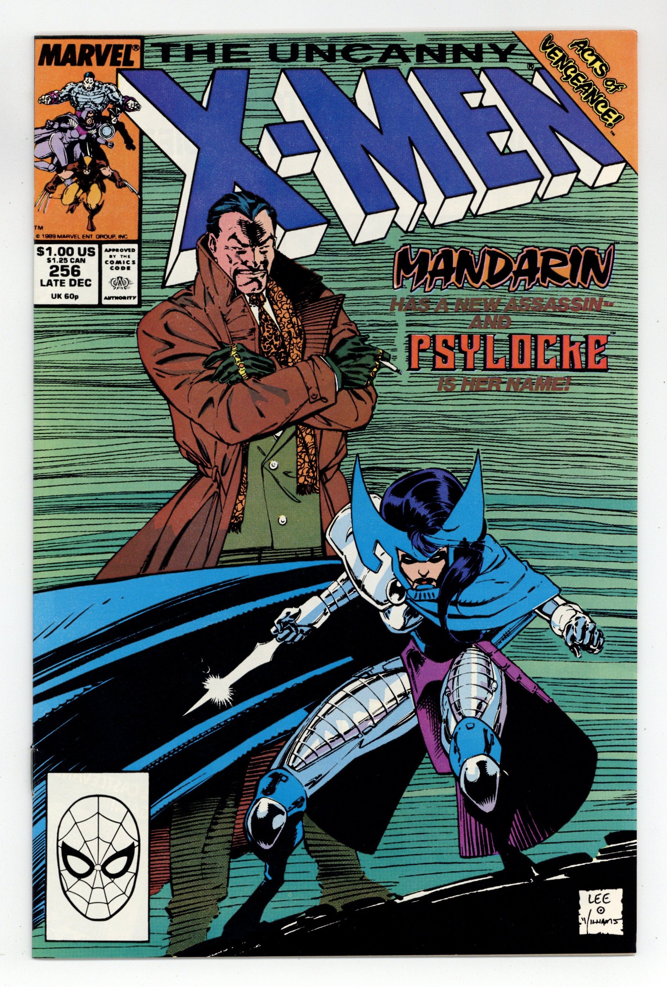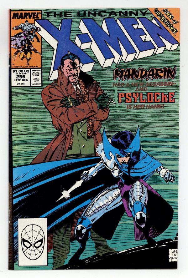 Direct Edition. Acts of Vengeance: Part 1 of 3. "The Key that Breaks the Locke!" Story by Chris Claremont. Art and cover by Jim Lee and Scott Williams. A cabal made-up of some of Marvel's most dangerous villains has gathered together to pull their resources and finally destroy the heroes who oppose them. This inner circle consists of Doctor Doom, Magneto, the Kingpin, Wizard, Red Skull, the Mandarin, and a mysterious benefactor. Their plan is to surprise their enemies with foes whom they've never faced. In this issue, Iron Man's arch nemesis the Mandarin takes on a new apprentice - Lady Mandarin! The X-Men know her as Psylocke. NOTE: 1st appearance of the ninja Psylocke. 36 pgs. Cover price $1.00.