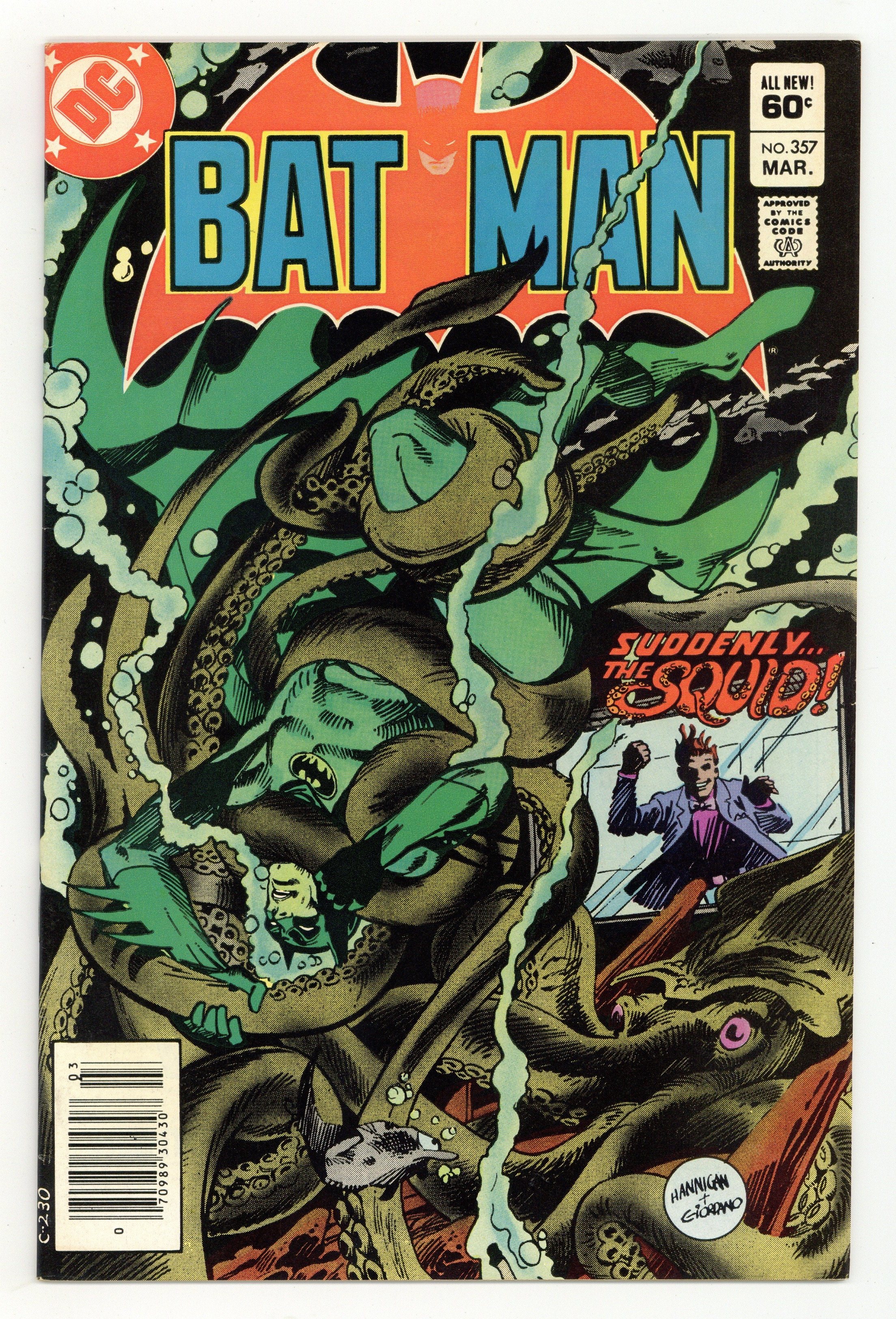 Tags: Batman$135.001st printing. Newsstand Edition. 1st appearance of Jason Todd and Killer Croc (cameo). Cover pencils by Ed Hannigan, inks by Dick Giordano. "Squid" starring Batman, Dick Grayson, Commissioner Gordon, Hamilton Hill, Joey Taylor, Waldo Flynn, Olivia Ortega, and the Squid (first appearance), script by Gerry Conway, pencils by Don Newton, inks by Alfredo Alcala; The Squid comes to Gotham City to launch a takeover of its underworld, and to trap the Batman; A mobster offering crooked protection threatens a circus owner; Refusing to give in, the owner unwittingly puts a target on the heads of his star performers, a husband and wife trapeze act; Days later, a young boy discoveres that his parents had been brutally murdered. Taken in by the sympathetic millionaire Bruce Wayne (Batman) the boy trains and becomes his new mentor's sidekick as Robin, the boy wonder; Not Dick Grayson, though--This time it was the copycat story of Jason Todd, the second person to become Robin. Story continues in the pages of Detective Comics (1937 1st Series) #524. Letter to the editor from comics editor/writer Kevin Dooley. 40 Pages, Full Color. Cover price $0.60.