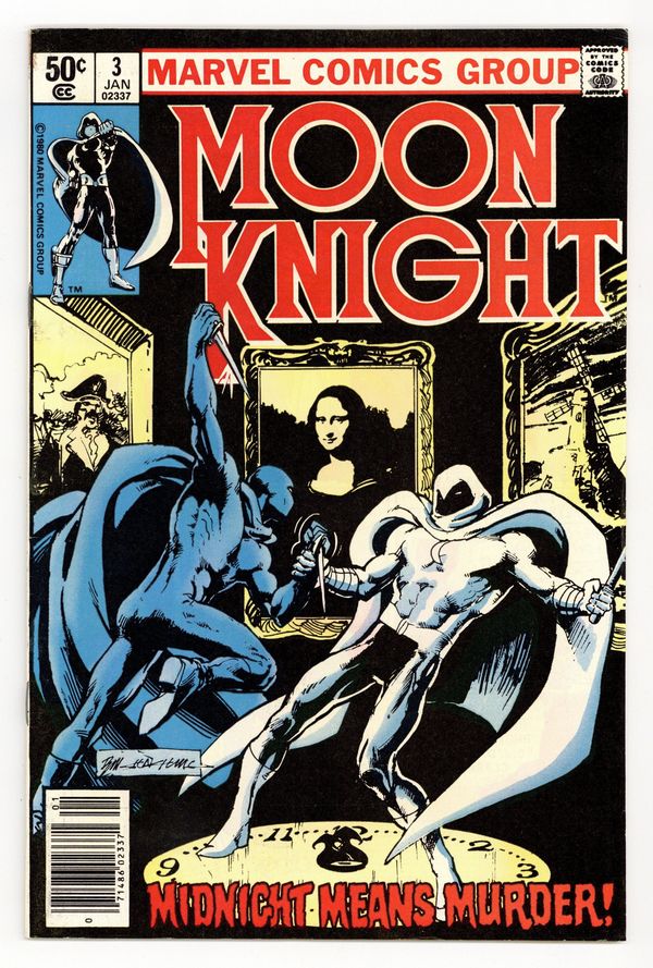 $15.75Newsstand Edition. "Midnight Means Murder!" Written by Doug Moench. Art by Bill Sienkiewicz. Moon Knight confronts killer whose unorthodox methods may prove to be the masked avenger's undoing. 32 pages, FC. Cover price $0.50.