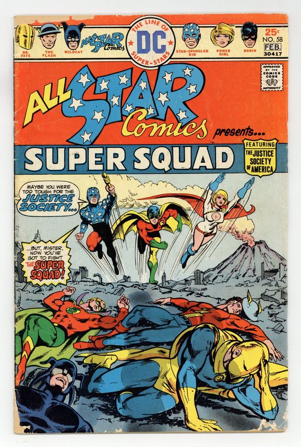 Starts Feb 16 1st appearance of Power Girl. Cover art by Mike Grell. The Super Squad! starring the All Star Super Squad, script by Gerry Conway, pencils by Ric Estrada, inks by Wally Wood; Power Girl describes the Super Squad as a strike force composed of the JSA and the three younger heroes--Robin, Power Girl, and Star-Spangled Kid. Letters from Roy Thomas and Jerry Bails. The Captive Commissioner Hostess ad starring Batman, pencils by Curt Swan, inks by Vince Colletta. 36 Pages, Full Color. Cover price $0.25.