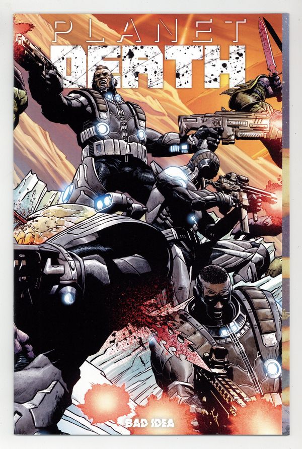 Published May 2025 by Bad Idea Comics.$43.00Limited 1 for 500 Retailer Incentive Variant Cover. Written by Derek Kolstad, Robert Venditti. Art by Tomas Giorello. Cover by Joe Quesada. Blockbuster screenwriter Derek Kolstad, creator and writer of the internationally acclaimed, box office dominating motion picture franchise JOHN WICK, New York Times best-selling writer Robert Venditti (Superman 78, Green Lantern), with visionary artist Tomás Giorello (Star Wars, Conan) and ten-time Eisner Award-winner Dave Stewart (Star Wars, Hellboy) have combined forces to bring you this essential first chapter in a groundbreaking new sci-fi epic.Millions of miles from home, hundreds of ships descend into the stormy atmosphere of a hostile frozen world. On board, an army of resolute men and women brace for the coming assault.They are an invasion force, on an impossible mission — destroy the devastating enemy weapon garrisoned below. Corporal Scott and his battalion are in the vanguard but the human forces are no match for their brutal alien adversaries. Scotts battalion is dead within moments. He is its lone survivor. The landing force annihilated, the battle is lost.Against overwhelming odds, Scott dares the unthinkable — cross behind enemy lines, survive the lethal landscape, evade capture by ruthless enemies, resist natural predators, face human deserters and finish the mission singlehandedly. Locked in his suit of full combat battle armor, sustained only by what he can carry, and driven by Earths wrath, Scott must do by himself what an entire army could not.Destroy the weapon.Return home. PLANET DEATH #0 is the must-read lead-in to Julys 40-page prestige format PLANET DEATH #1. 20 pages, full color. Rated T+ Cover price $1.99.