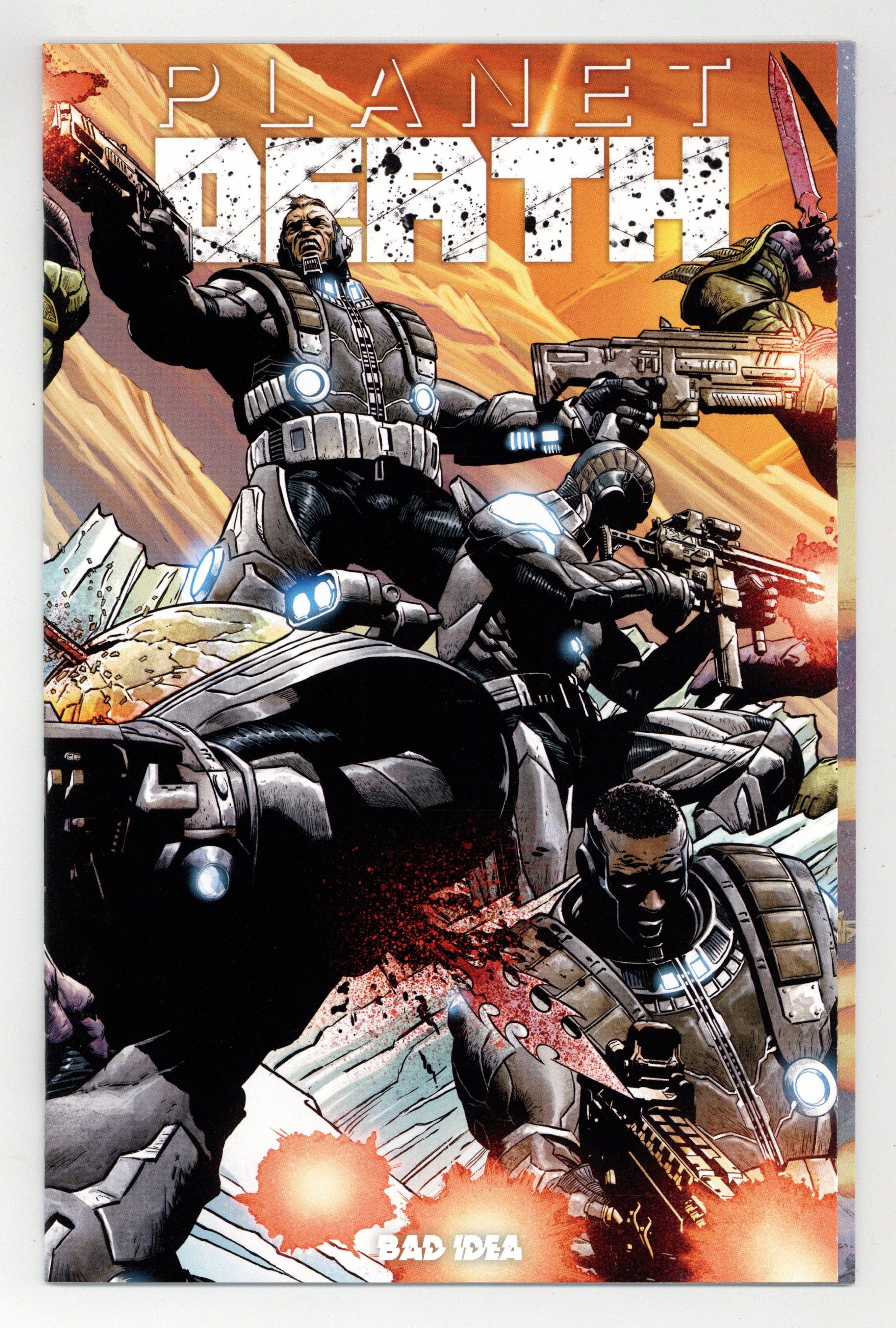 Published May 2025 by Bad Idea Comics.$45.00Limited 1 for 500 Retailer Incentive Variant Cover. Written by Derek Kolstad, Robert Venditti. Art by Tomas Giorello. Cover by Joe Quesada. Blockbuster screenwriter Derek Kolstad, creator and writer of the internationally acclaimed, box office dominating motion picture franchise JOHN WICK, New York Times best-selling writer Robert Venditti (Superman 78, Green Lantern), with visionary artist Tomás Giorello (Star Wars, Conan) and ten-time Eisner Award-winner Dave Stewart (Star Wars, Hellboy) have combined forces to bring you this essential first chapter in a groundbreaking new sci-fi epic.Millions of miles from home, hundreds of ships descend into the stormy atmosphere of a hostile frozen world. On board, an army of resolute men and women brace for the coming assault.They are an invasion force, on an impossible mission — destroy the devastating enemy weapon garrisoned below. Corporal Scott and his battalion are in the vanguard but the human forces are no match for their brutal alien adversaries. Scotts battalion is dead within moments. He is its lone survivor. The landing force annihilated, the battle is lost.Against overwhelming odds, Scott dares the unthinkable — cross behind enemy lines, survive the lethal landscape, evade capture by ruthless enemies, resist natural predators, face human deserters and finish the mission singlehandedly. Locked in his suit of full combat battle armor, sustained only by what he can carry, and driven by Earths wrath, Scott must do by himself what an entire army could not.Destroy the weapon.Return home. PLANET DEATH #0 is the must-read lead-in to Julys 40-page prestige format PLANET DEATH #1. 20 pages, full color. Rated T+ Cover price $1.99.