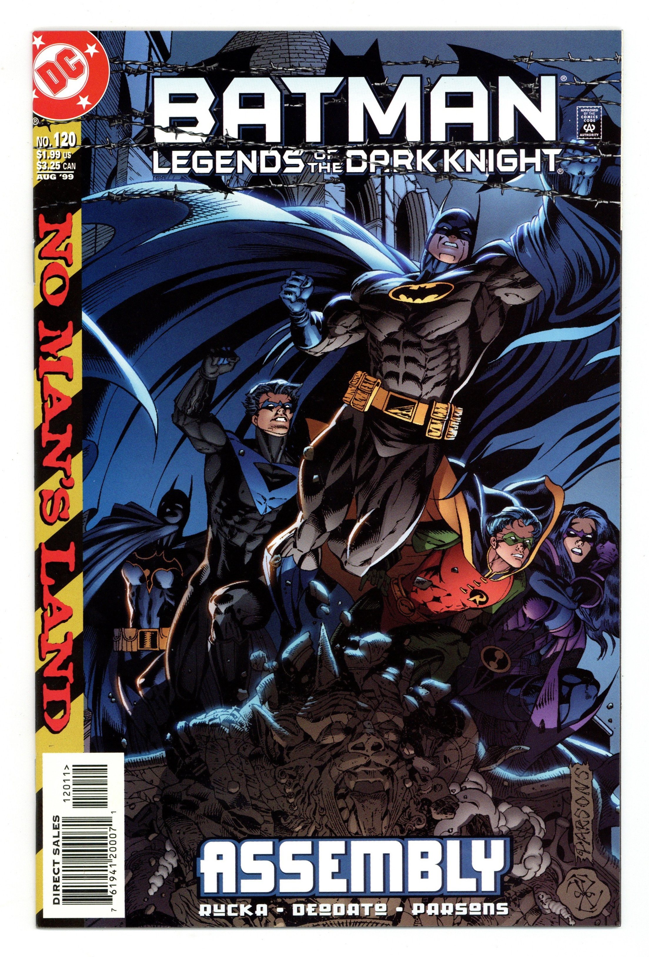 Tags: Batman No Man's Land (part 26)$28.00WRITTEN BY GREG RUCKA; ART BY MIKE DEODATO, JR. AND SEAN PARSONS; COVER BY DALE EAGLESHAM AND SEAN PARSONS. Batman gathers his forces in "Assembly," a self-contained story that represents a critical turning point in the battle to reclaim "No Man's Land," beginning with the revelation of Batgirl's true identity! The Dark Knight has alienated those who once trusted him with their lives ? Robin, Nightwing and Oracle among them. After unmasking the new Batgirl and replacing her with another mysterious heroine and summoning Azrael to his side, Batman must now regain his former allies' trust and co-ordinate their efforts if his plan to regain control of Gotham is to succeed. (Note: Other aspects of the "Assembly" are revealed in NIGHTWING #34 and ROBIN #64, found elsewhere in this issue of Previews). FC, 32 PG.$1.99*" Cover price $1.99.