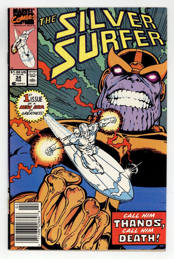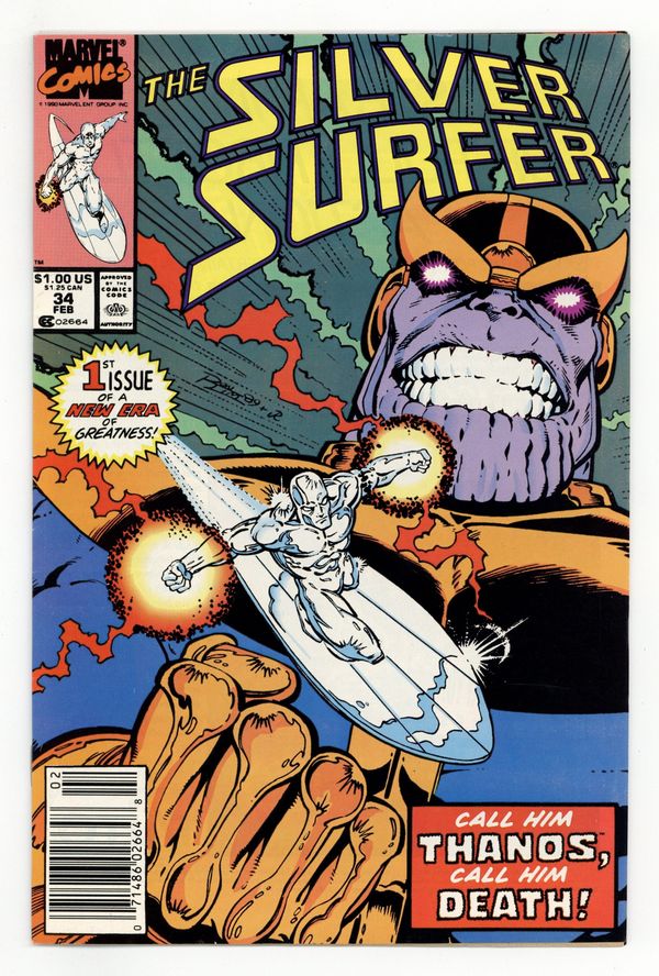Newsstand Edition. Infinity Gauntlet: Prelude - Rebirth of Thanos: Part 1 of 5 - "...Even Demigods must Dream!" Featuring the return of Thanos. Story by Jim Starlin. Art by Ron Lim and Tom Christopher. The Silver Surfer tours the realm of Death. And, by story's end, witness the triumphant return of one of the Marvel Universe's most dangerous villains, the Mad Titan, Thanos. 32 pages.