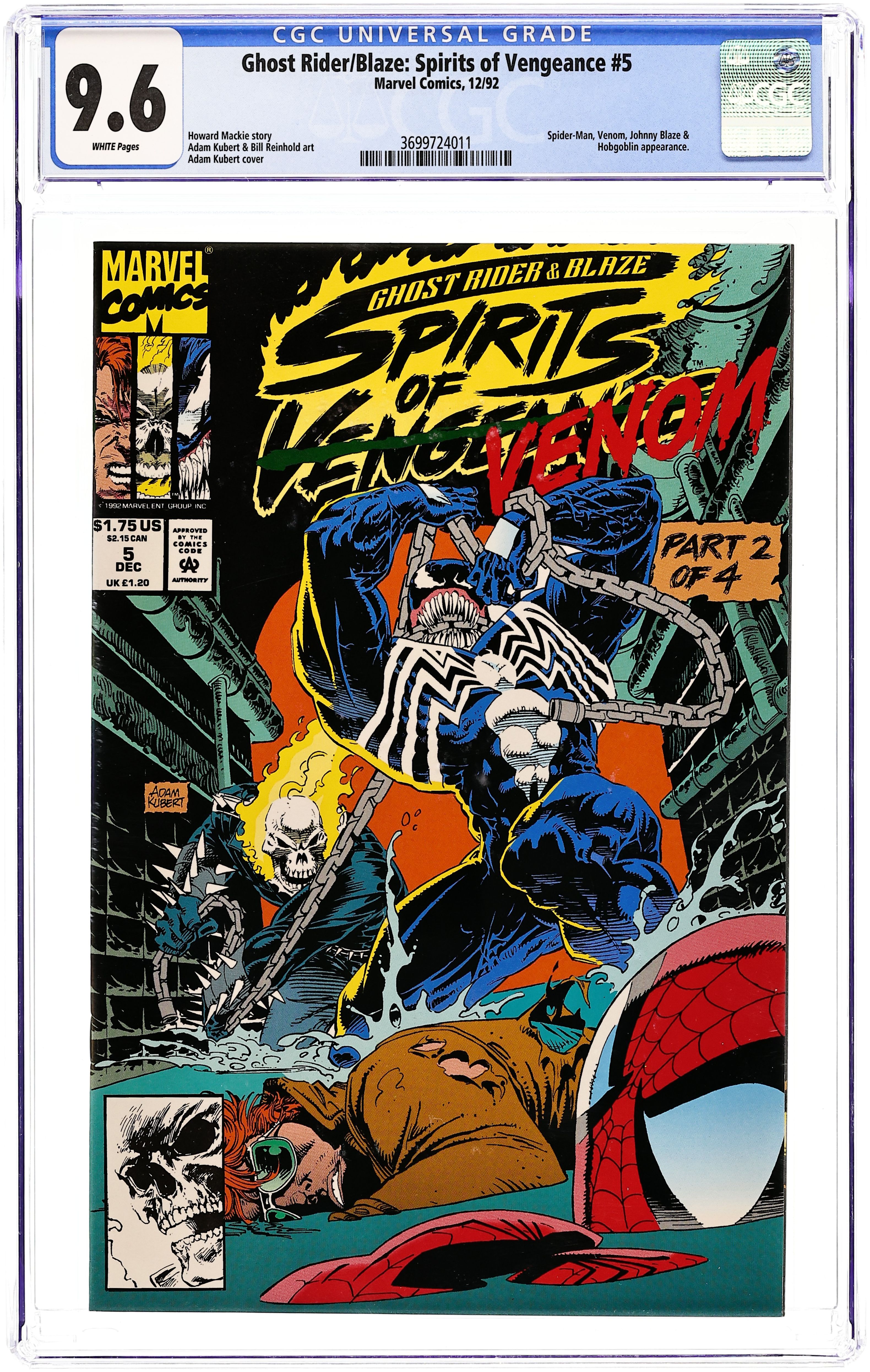 Direct Edition. "Chasing Shadows" Part 2 of 4. Guest-starring Spider-Man. Script by Howard Mackie. Pencils by Adam Kubert. Inks by Bill Reinhold. Cover by Adam Kubert. Story continues from Web of Spider-Man 95. The rip-roaring battle among a host of heroes and villains continues below the streets! In the dampness and darkness of the New York sewer system, the swarming Deathspawn gain the upper hand! And carry away the web-slinger, Hobgoblin, Demogoblin, doppelganger, and parish priest! Thus leaving Johnny Blaze, Ghost Rider, and Venom to figure out where the Deathspawn have taken their prey! However, the three anti-heroes are not overly interested in working together! But as the old expression goes…the enemy of my enemy is my friend…and so forth! Can the new trio of teammates find the amazing one and the goblins before it's too late? Story continues in Web of Spider-Man 96. Cameo appearances by Hag, Troll, and Deathwatch. 32 pages Cover price $1.75.