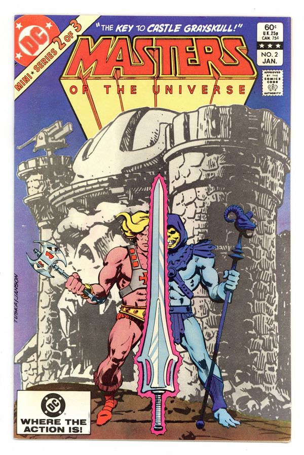$23.50Direct Edition. "The Key to Castle Grayskull!' Written by Paul Kupperberg. Art by George Tuska and Alfredo Alcala. Cover by George Tuska and Klaus Janson. The evil warlock Skeletor has taken the beautiful Goddess prisoner. Now, in order to save their friend, He-Man and his mighty companion Battle-Cat find themselves embarking on a harrowing quest at the behest of their most hated enemy. They seek the legendary Power Sword, the most powerful weapon in the universe. But the ancient blade has been split and time is running out. Can our heroes survive the perils of the quest and triumph where so many before have perished? 32 pages, FC. Cover price $0.60.