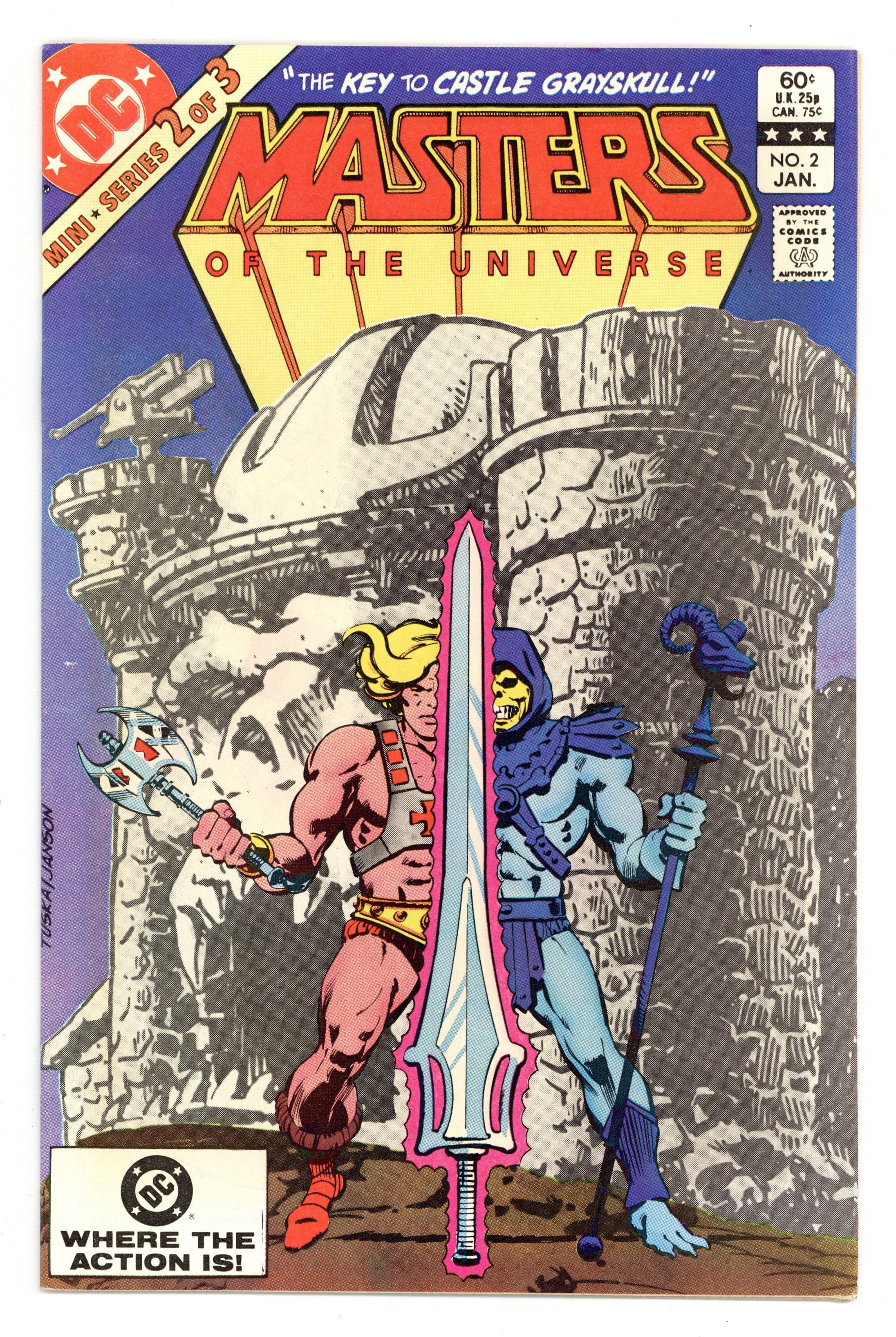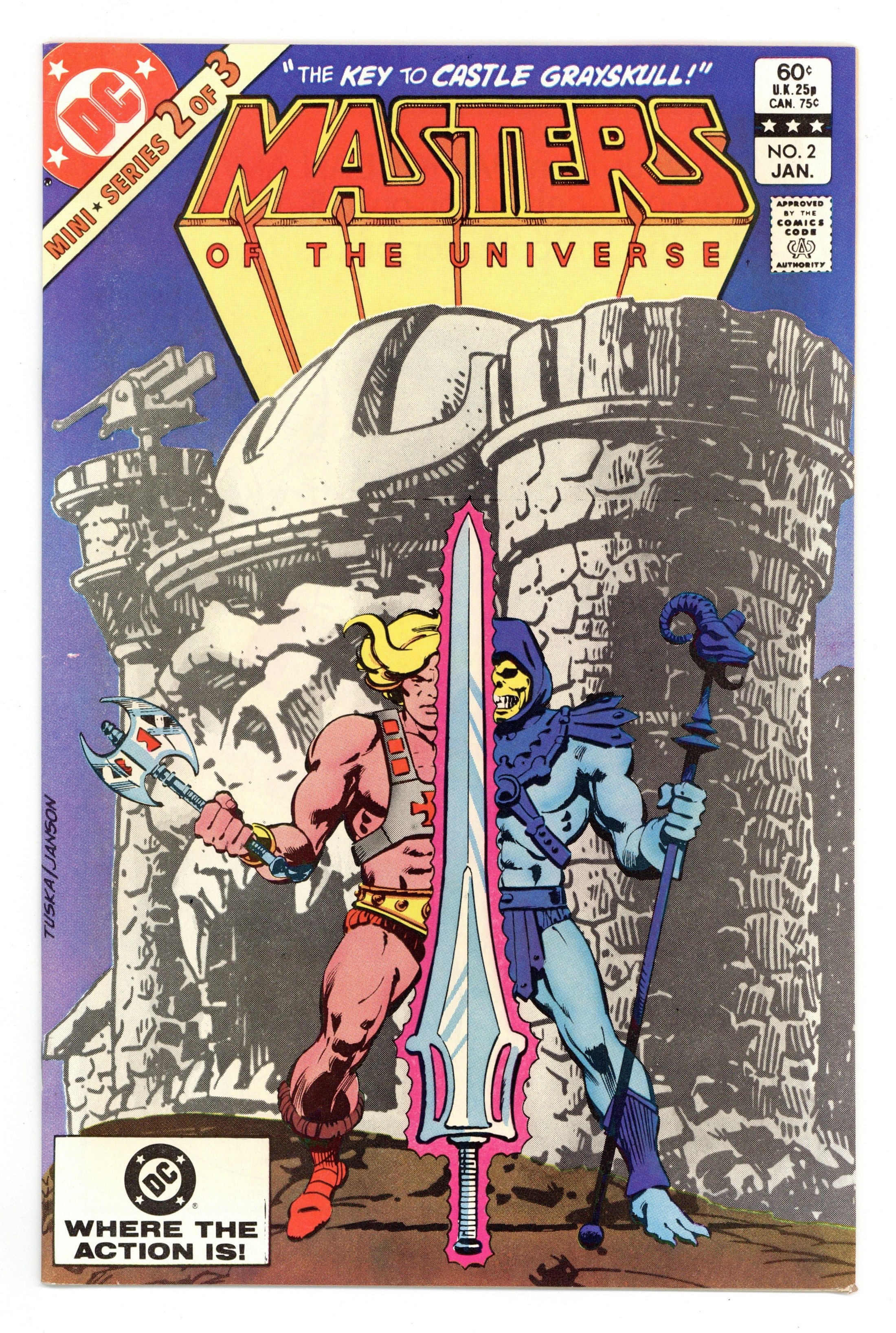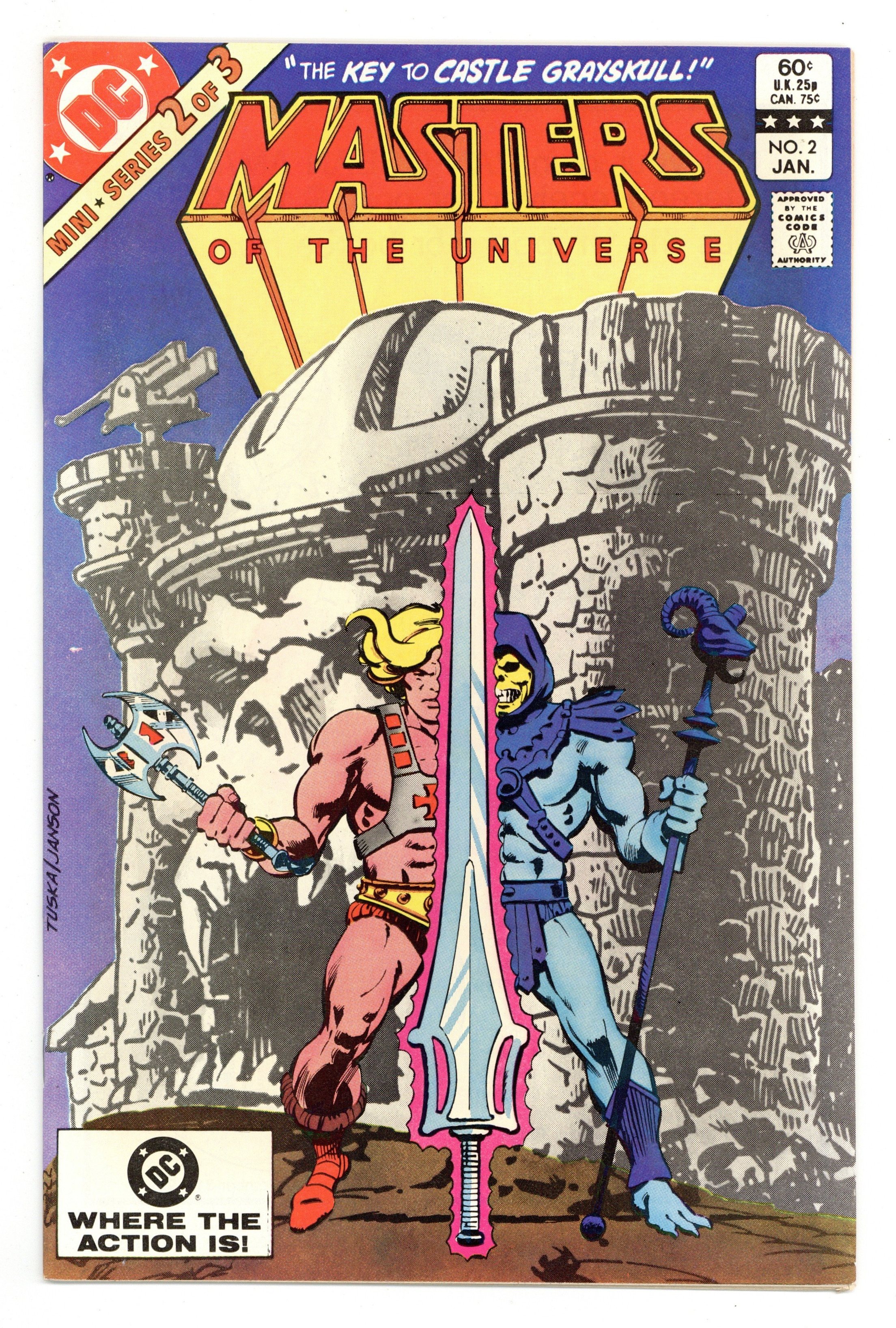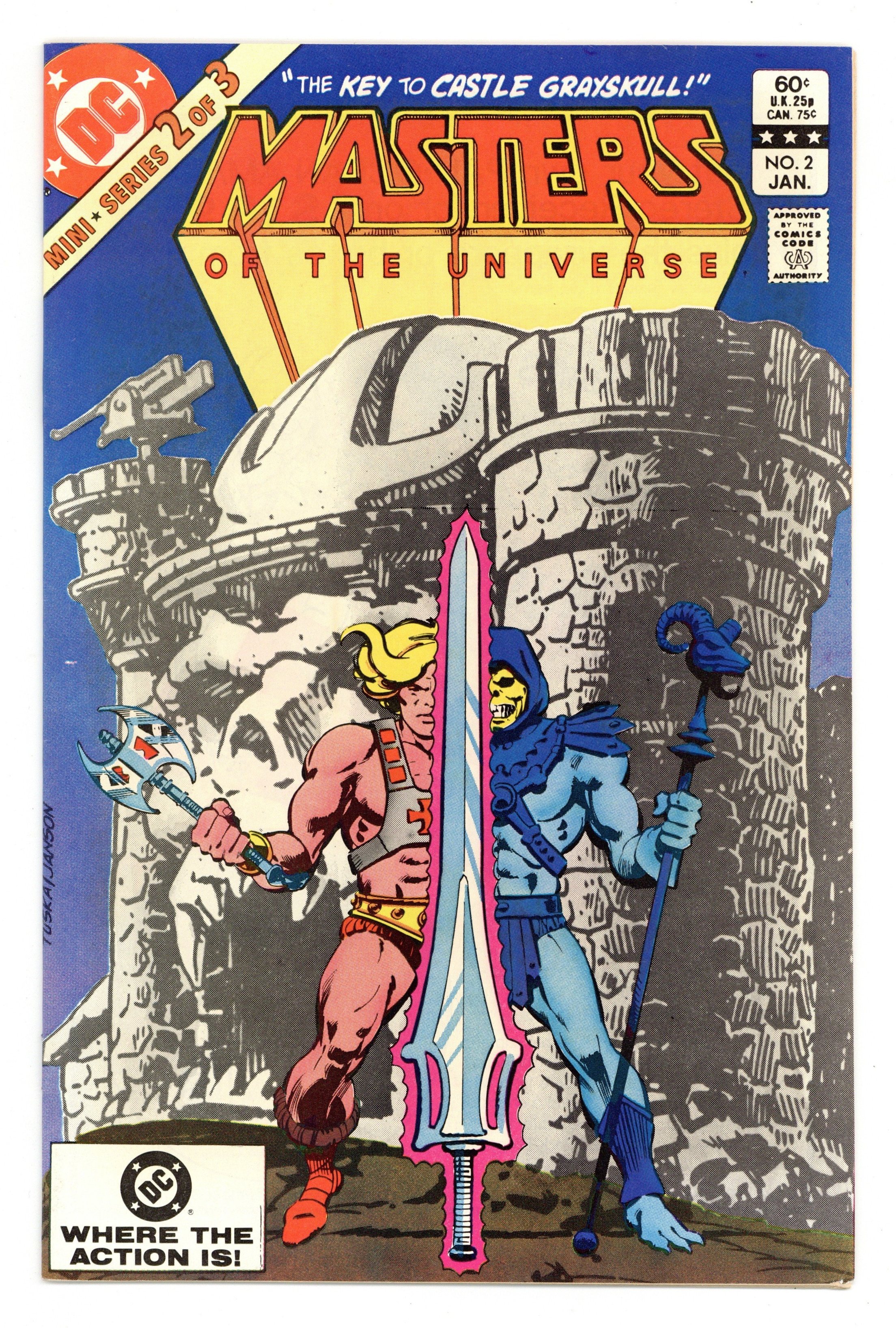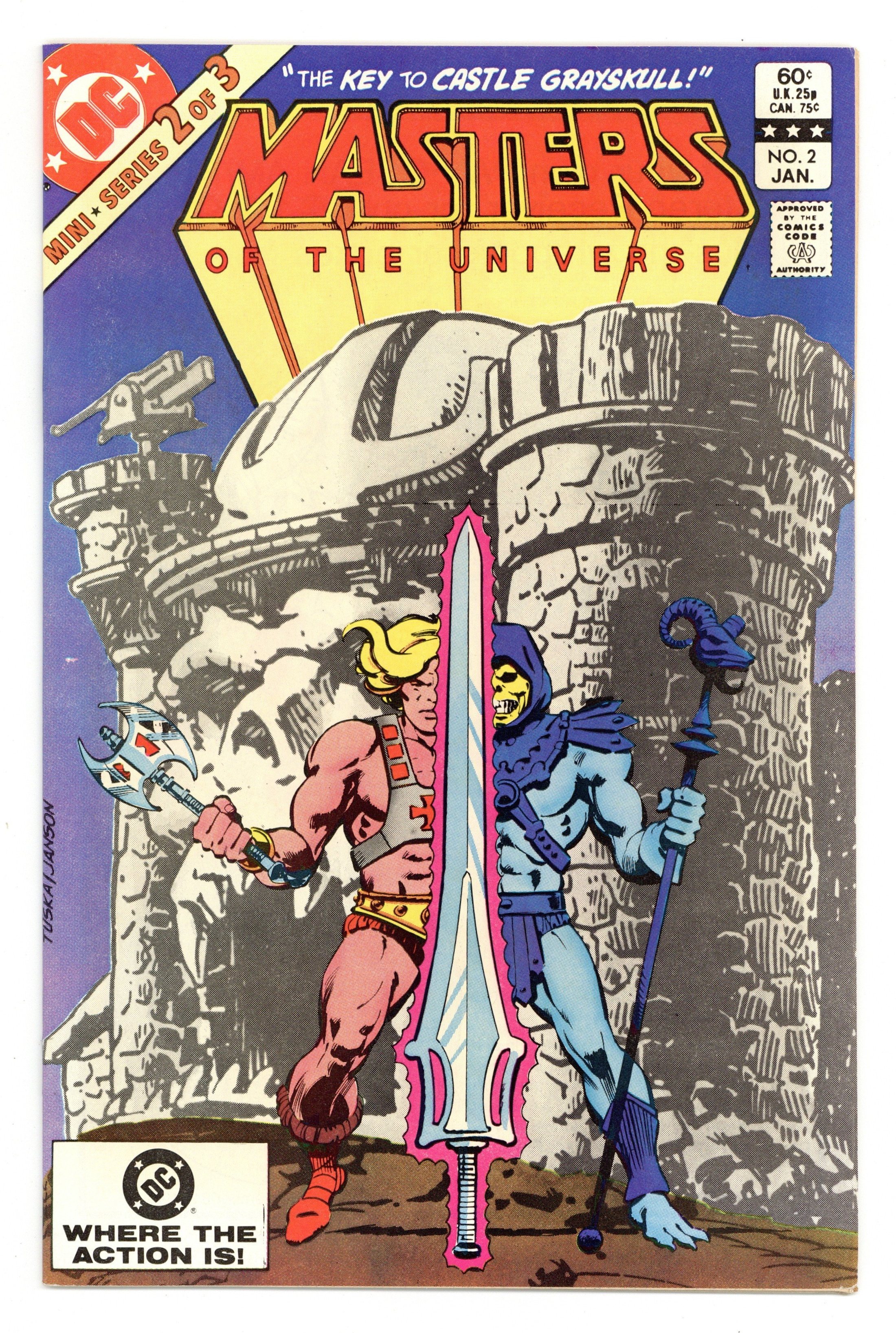 Direct Edition. "The Key to Castle Grayskull!' Written by Paul Kupperberg. Art by George Tuska and Alfredo Alcala. Cover by George Tuska and Klaus Janson. The evil warlock Skeletor has taken the beautiful Goddess prisoner. Now, in order to save their friend, He-Man and his mighty companion Battle-Cat find themselves embarking on a harrowing quest at the behest of their most hated enemy. They seek the legendary Power Sword, the most powerful weapon in the universe. But the ancient blade has been split and time is running out. Can our heroes survive the perils of the quest and triumph where so many before have perished? 32 pages, FC. Cover price $0.60.
