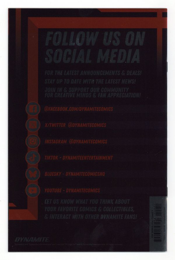 Tags: Vampirella, VampiresPublished 2025 (est.) by Dynamite Entertainment.$36.00Virgin Foil Cover. Written by Christopher Priest. Art by Ergun Gunduz. Cover by Mark Spears. Unable to cope with the emotional distress of postpartum depression, Vampirella begins to devolve into a dark psychosis, imagining the best future for her infant son is perhaps no future at all. Meanwhile, the mysterious stranger claiming to be Cicero, Vampirella's infant son somehow transported back from half a century in the future, provides a glimpse of that dark future to Vampirella's therapist, Doc Chary, to whom Cicero has turned for help. 32 pages, full color. Rated T+ Cover price $29.99.