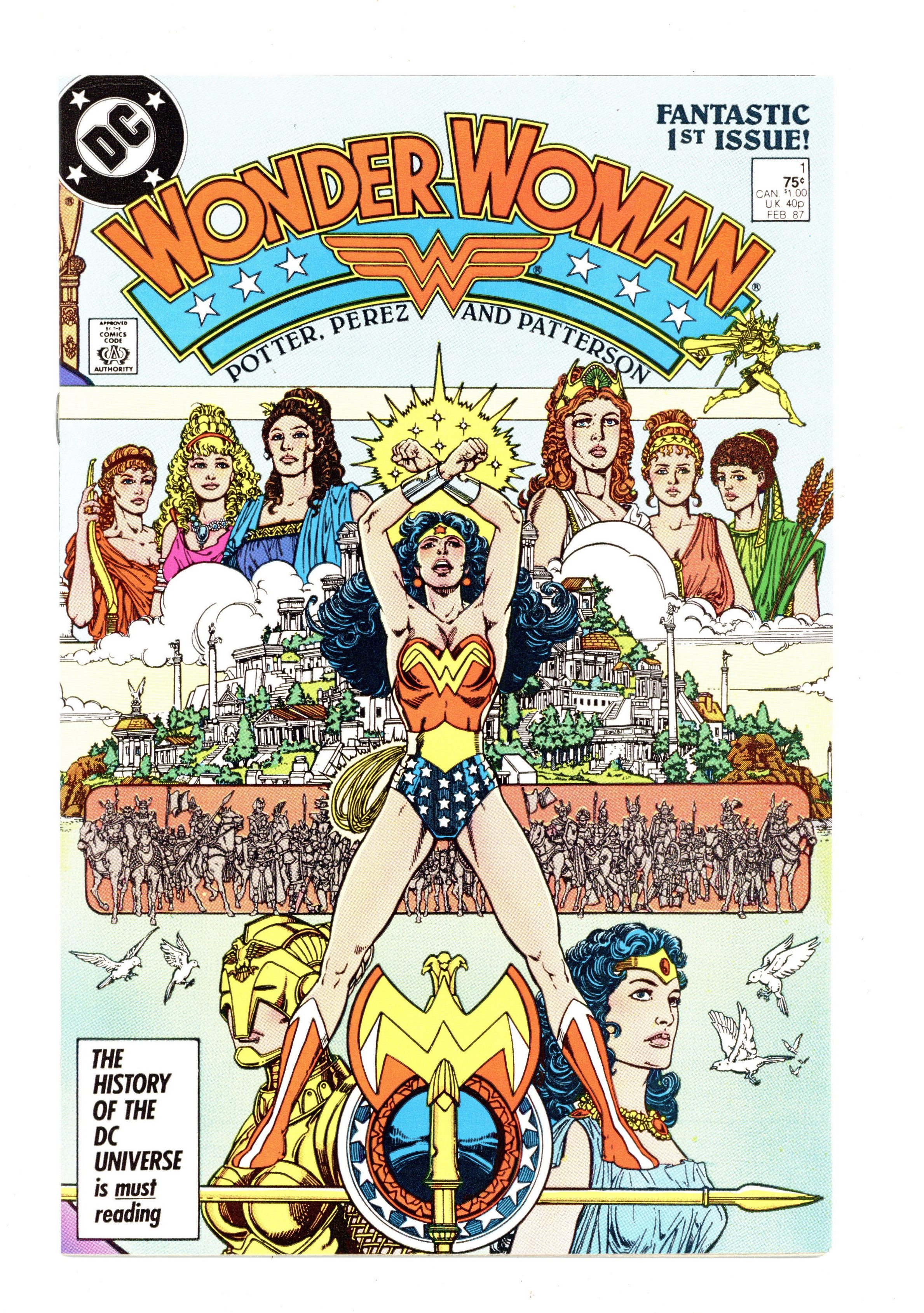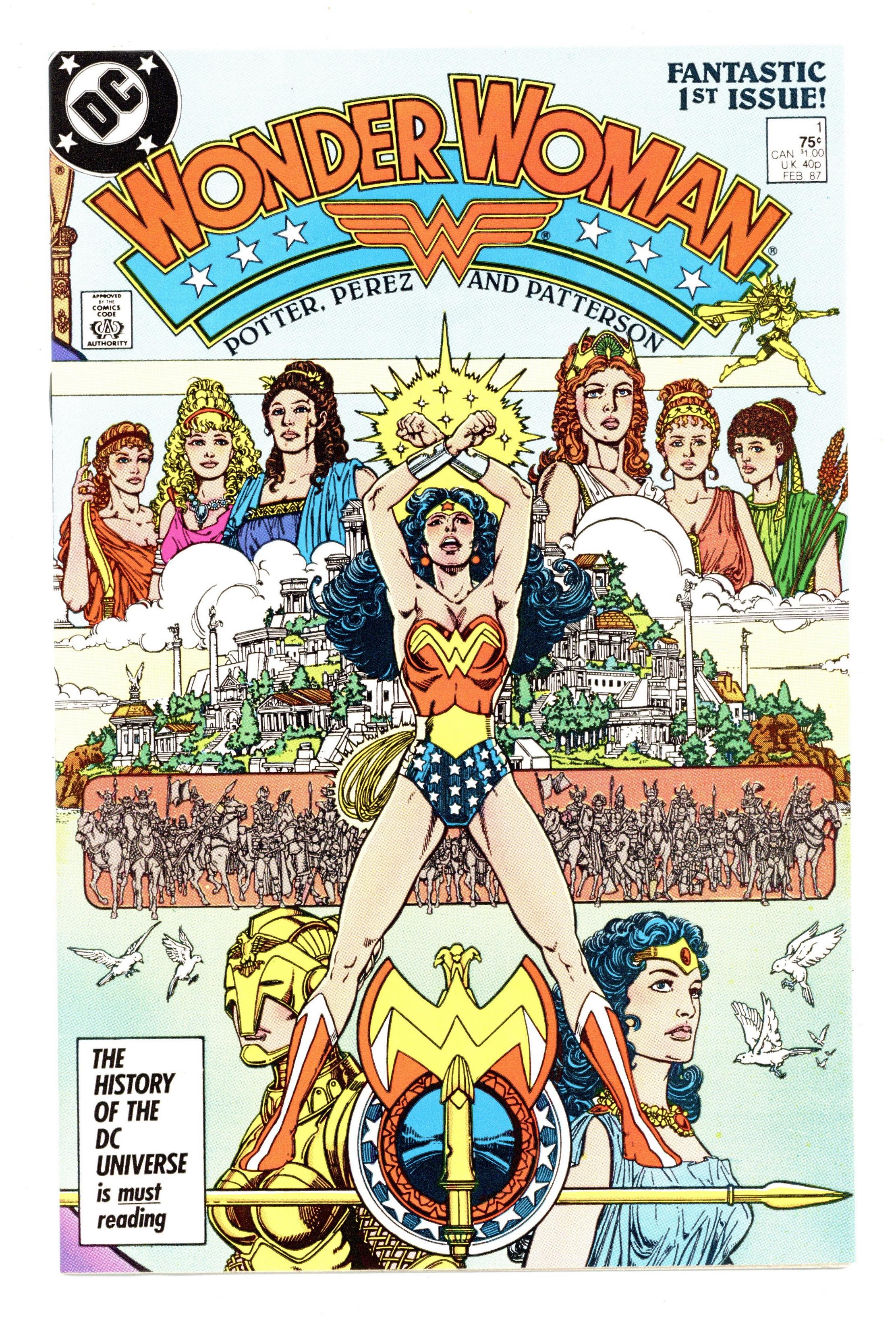 Starts Feb 2 Direct Edition. In this post-Crisis on Infinite Earths re-imagining of the Wonder Woman mythos, Diana is born of clay, growing on Paradise Island to become the champion of the Amazons. "The Princess and the Power!" Part 1 of 6, continued next issue. Script by Greg Potter, co-plot and pencils by George Perez, inks by Bruce Patterson. Perez inks first 2 pages and the final page. Wrap-around cover. No ads. Perez cover. 36 pgs. Cover price $0.75.