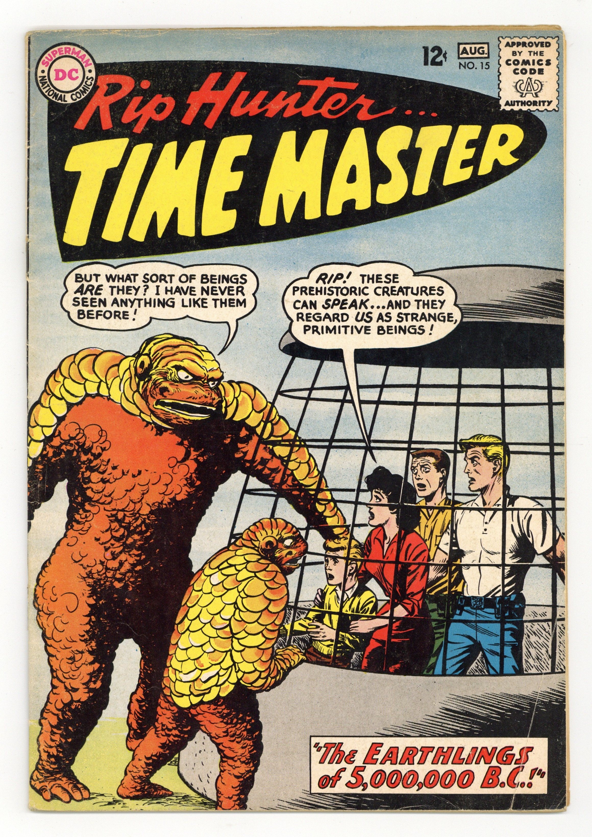 Written by Jack Miller. Art and Cover by Bill Ely. Rip Hunter, Jeff Smith, Bonnie Baxter and Corky Baxter encounter prehistoric creatures who can speak...and who regard our heroes as strange, primitive beings! Don't miss the exciting 3-part adventure by Jack Miller and Bill Ely: "The Earthlings of 5,000,000 B.C."; "Chapter 2: The Experimental Creatures"; and "Chapter 3: The Day the Earth Died"! 32 pages, full color. Cover price $0.12.