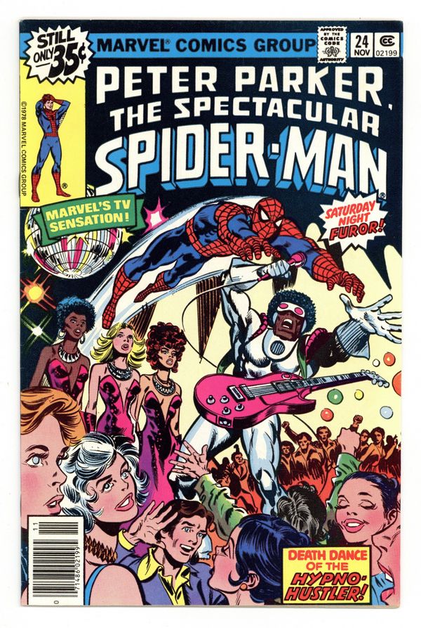Tags: Marvel Legacy Numbering: Spectacular Spider-Man (part 24), Spider-Man$30.00"Spider-Man Night Fever" Script by Bill Mantlo. Pencils and Inks by Frank Springer. It's 1978 in New York City and disco music is king! After coming up one class short of graduating from college in Amazing Spider-Man 185, Peter Parker joins his friends for a night of dancing at the Beyond Forever Disco! While Peter, Betty, Mary Jane, Flash, Harry, and Liz are grooving on the dance floor, the Hypno-Hustler makes his move! If the web-slinger can avoid the shimmering disco ball and the dangerous back-up singers, he might have a chance of stayin' alive vs. the Hypno-Hustler! A fun story from a unique era of American music. 32 pages Cover price $0.35.