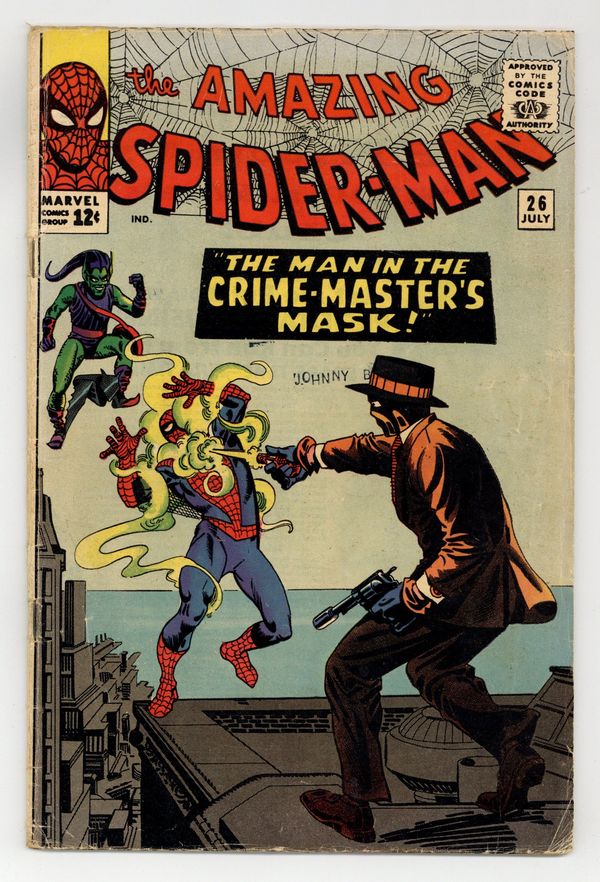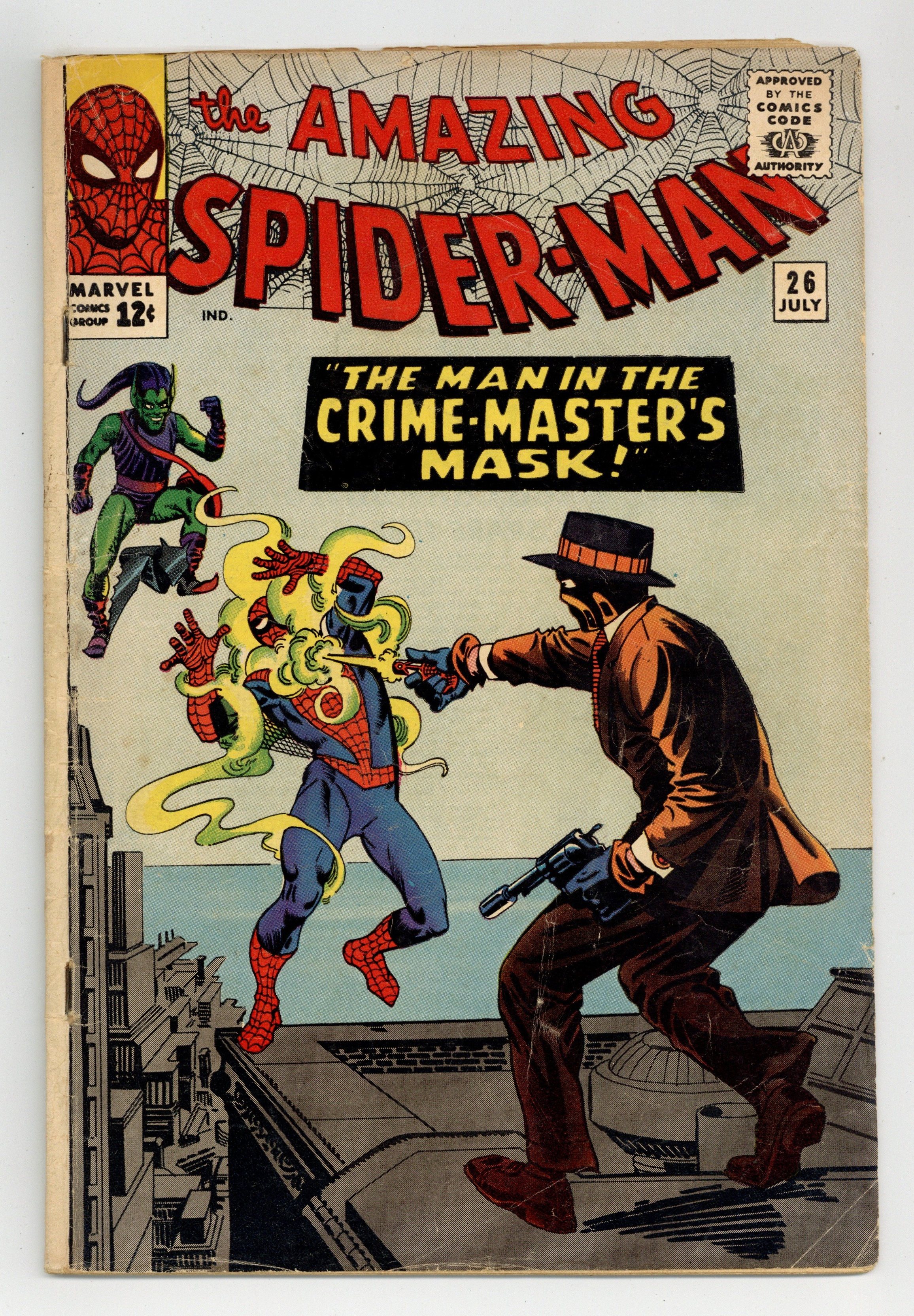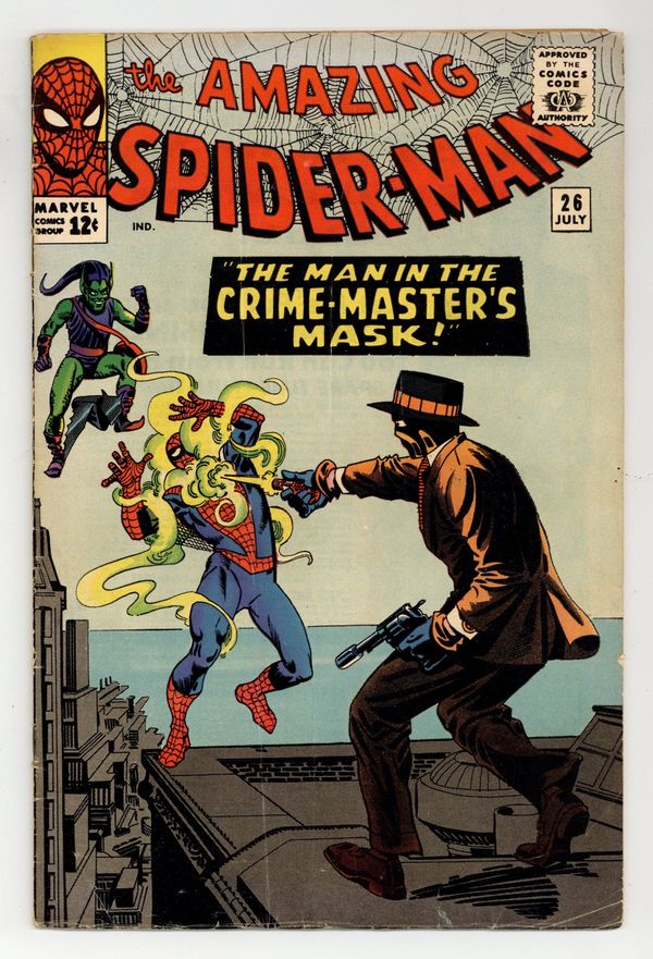 Starts Jan 3 Cover art by Steve Ditko. Fourth appearance of the Green Goblin and first appearance of the Crime Master in The Man In The Crime-Master's Mask, script by Steve Ditko (plot) and Stan Lee (script), art by Steve Ditko; Spider-Man battles the Crime-Master and the Green Goblin. Reprinted in Marvel Tales # 21 and 164. Letter to the editor from comics writer Steve Gerber. 36 pgs. $0.12. Cover price $0.12.