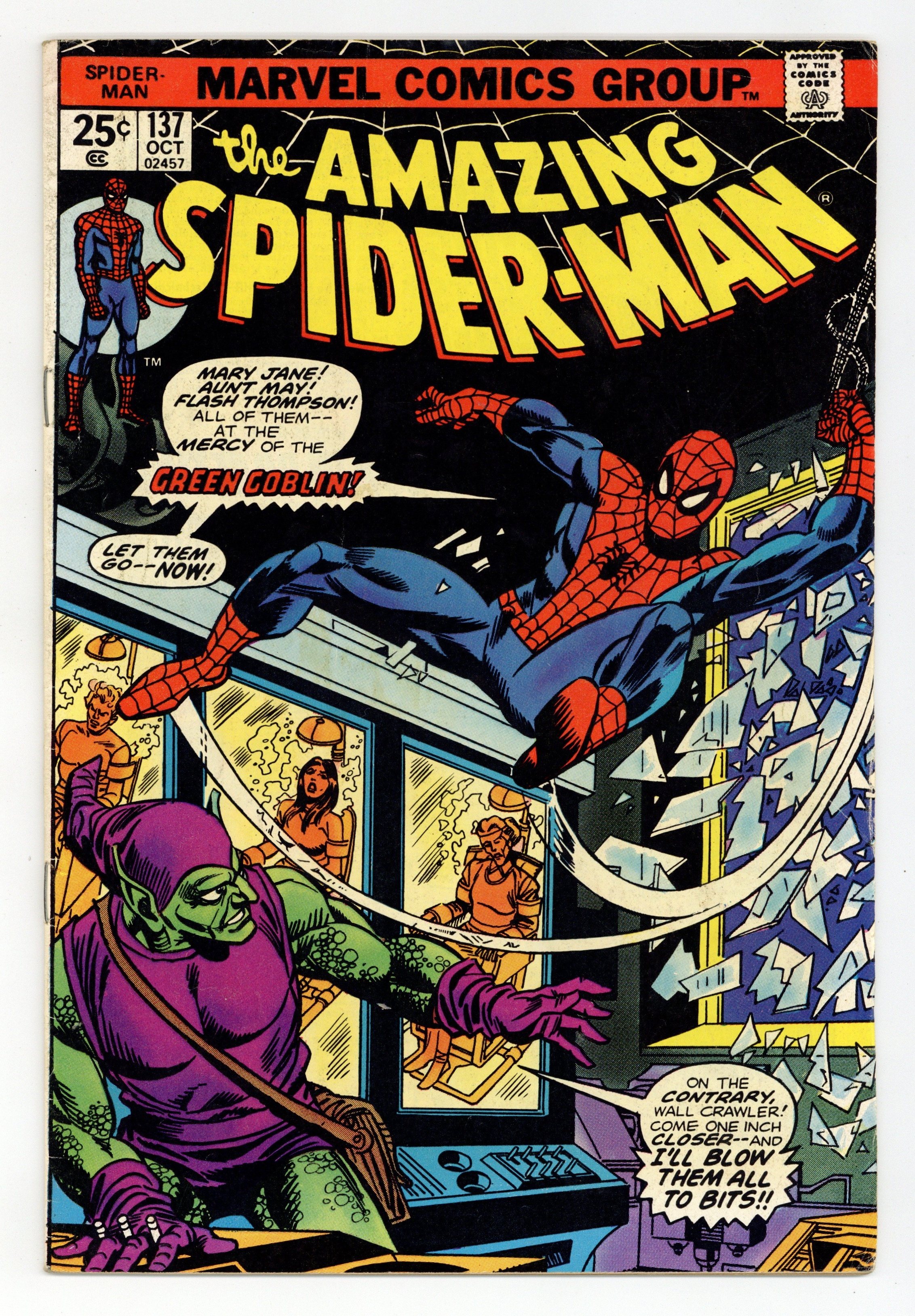 Tags: Marvel Legacy Numbering: Amazing Spider-Man (part 137), Spider-Man$15.50Cover by Gil Kane. Harry Osborn's second appearance as the Green Goblin in Death Trap Times Three, script by Gerry Conway, pencils by Ross Andru, inks by Frank Giacoia and Dave Hunt; Green Goblin attacks a truck carrying radioactive materials; What is the villains end goal with this dangerous bounty?; Plus, Peters friends and family rally to MJs side after she is injured by an explosive; Green Goblin makes Spider-Man choose between saving his friends, or Aunt May! Reprinted in Marvel Tales # 114. Letter to the editor from writer Charles Hoffman. The letters page also has Marvel Value Stamp series A # 99. 36 pgs., full color. $0.25. Cover price $0.25.