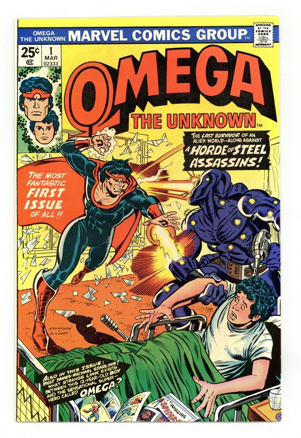 Starts Apr 4 With Marvel Value Stamp. Cover by Ed Hannigan and Joe Sinnott. Omega the Unknown, script by Mary Skrenes and Steve Gerber, art by Jim Mooney; Omega the Unknown, the last survivor of an alien world, battles a horde of steel assassins; a 12-year-old boy has a mysterious link with Omega. Marvel Value Stamp. 36 pgs., full color. $0.25. Cover price $0.25.