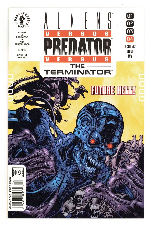 Tags: PredatorPublished Jul 2000 by Dark Horse.$30.00by Mark Schultz, Mel Rubi, and Christopher Ivy; cover by Dwayne Turner This is the cataclysmic, atom-smashing climax to end all climaxes, as Aliens, Predators, Terminators and humans collide...with all of the future as the prize! No one, no thing walks away from this one unscarred; after years (centuries, actually) of victimization and horror, will Ripley regain control of her life? She may come out on top of the Aliens, Predators, and Terminators, but don't bet on a "happy" ending! On sale July 26 FC, 32pg (4 of 4) Cover price $2.95.