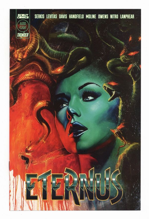 Published Oct 2021 by Scout Comics.$9.00Ashcan Preview of Eternus (2022 Scout Comics). Story by Anastazja Davis and Don Handfield. Art by Karl Moline and Andy Owens. Wraparound Cover by Rob Prior. From creators Andy Serkis and Andrew Levitas! 360 CE. The great god Zeus is long dead, brutally murdered in his own temple some thirty years prior. Heracles, Zeus's son and champion, spends his days drunk and depressed as the old gods struggle to stay alive after decades of Christian disruption. When Athena's Temple is sacked by a mysterious Centurion looking for a powerful relic that once belonged to Zeus, the old gods are convinced they have found Zeus's killer. Now the mighty Heracles must sober up long enough to keep the lone witness, a 9-year-old blind priestess, alive long enough to identify the killer and finally find justice for his dead father.