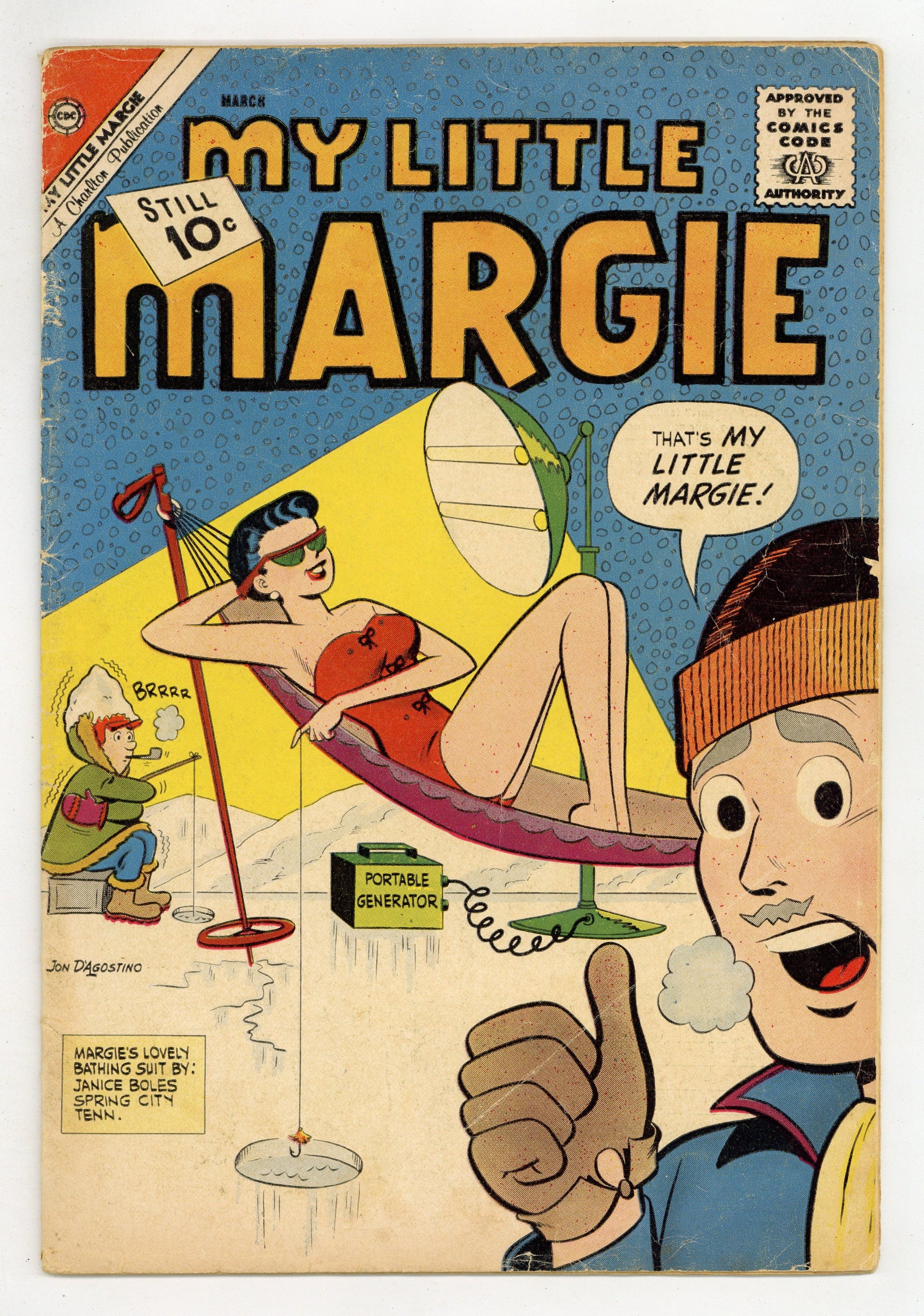Cover by Jon D'Agostino and Janice Boles. Stories and art by Jon D'Agostino and others. Charlton presents the misadventures of the popular TV/radio show character and her long-suffering father, Vern. Margie has a "blind date" with a guy who called the wrong number, but her dad wants her to date one of his clients instead. Roles are reversed when dental-phobic Vern must go to the dentist and Margie has to convince him. When a departed uncle leaves her a "pug," Margie thinks it's a dog, but it's actually a flyweight boxer whose career she must now manage. Fashion and story pages feature Margie in reader-designed fashions that acknowledge the designer by name, even on the cover. Plus activity pages and Margie paper dolls. Wrong Number; To Tell the Tooth!; Margie's Dad: Watch It; My Little Margie's Puzzle Page; The Light Fantastic; My Little Margie's Cut-Out Dolls; In This Corner; My Little Margie's Gag Page; Captain Corey's Curiosity Corner. 32 pages, Full Color. Cover price $0.10.