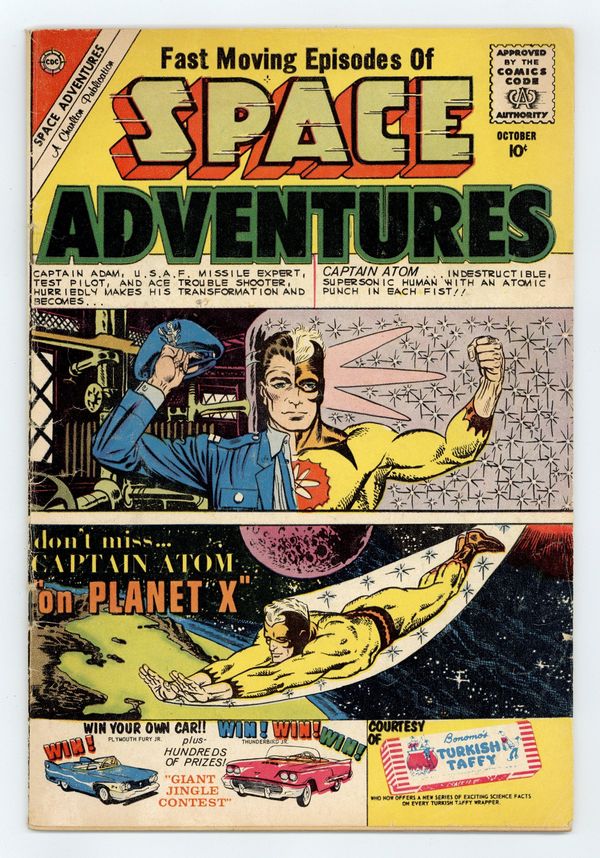 Cover art by Steve Ditko. "The Wreck of X-44," script by Joe Gill, art by Steve Ditko; The rocket-ship that Captain Atom is testing has been sabotaged. "The Galactic Souvenir," art by Rocco "Rocke" Mastroserio. "Penetro" text story. "The Omnipotent Robot," pencils by Bill Molno, inks by Vince Alascia; A scientist Siroco created Tondo, the Omnipotent robot, for space exploration; The planet where Tondo was created is not named, but a man whom Sirco calls 'Your Excellency' desires to use Tondo to explore possible worlds to invade and spread despotism. "Captain Atom On Planet X," script by Joe Gill, art by Steve Ditko; Captain Atom guards a new orbital satellite from enemy missiles. 36 pgs., full color. Cover price $0.10.