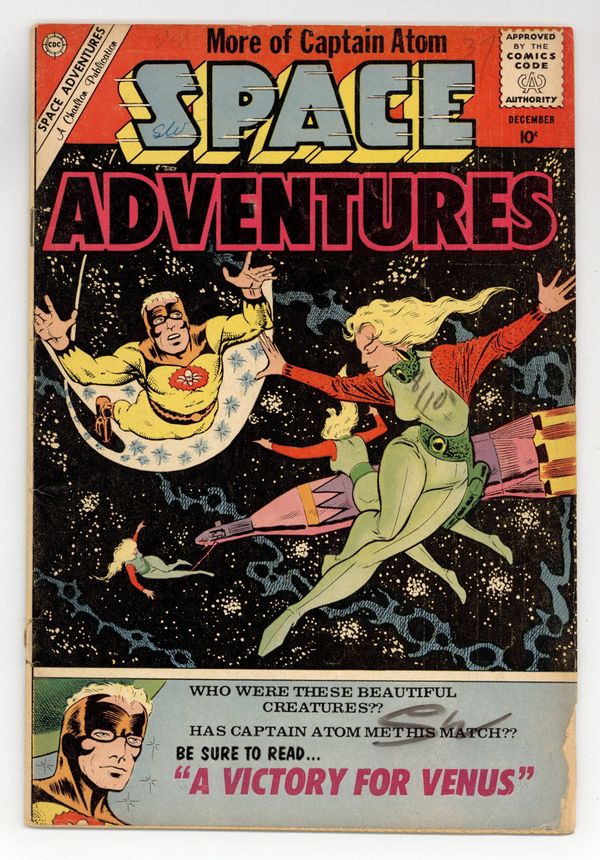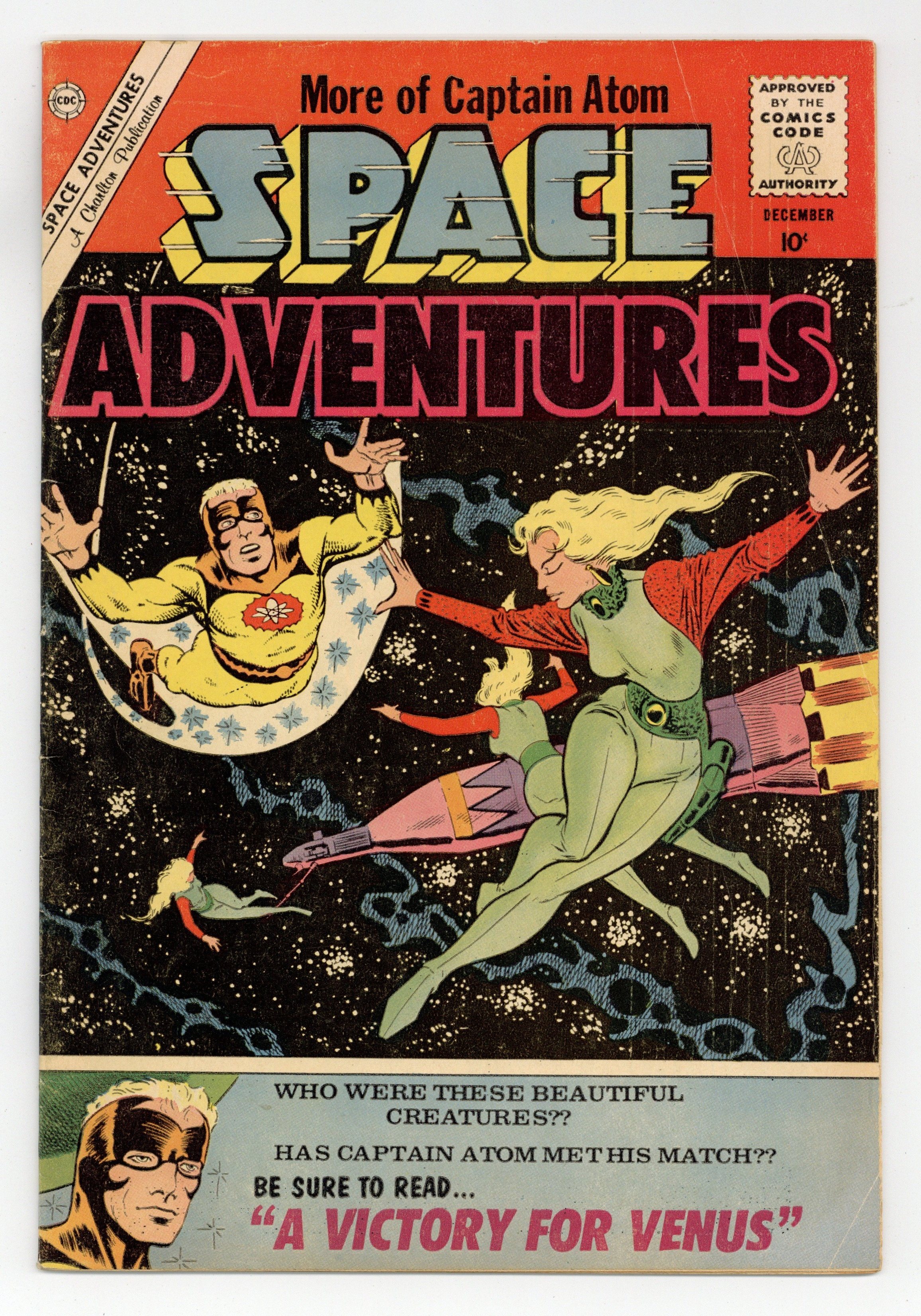 Cover art by Steve Ditko. "The Space Prowlers," script by Joe Gill, art by Steve Ditko; Captain Atom stops an alien invasion; President of the United States app. "Flight 101 to Nowhere," art by Bill Molno. "The Super-Men from Space," art by Rocco "Rocke" Mastroserio. "Enemy Overhead," pencils by Bill Molno, inks by Vince Alascia. "Quaxonite" text story. "A Victory for Venus," script by Joe Gill, art by Steve Ditko; Captain Atom travels to Venus to see who destroyed an American satellite. 36 pgs., full color. Cover price $0.10.