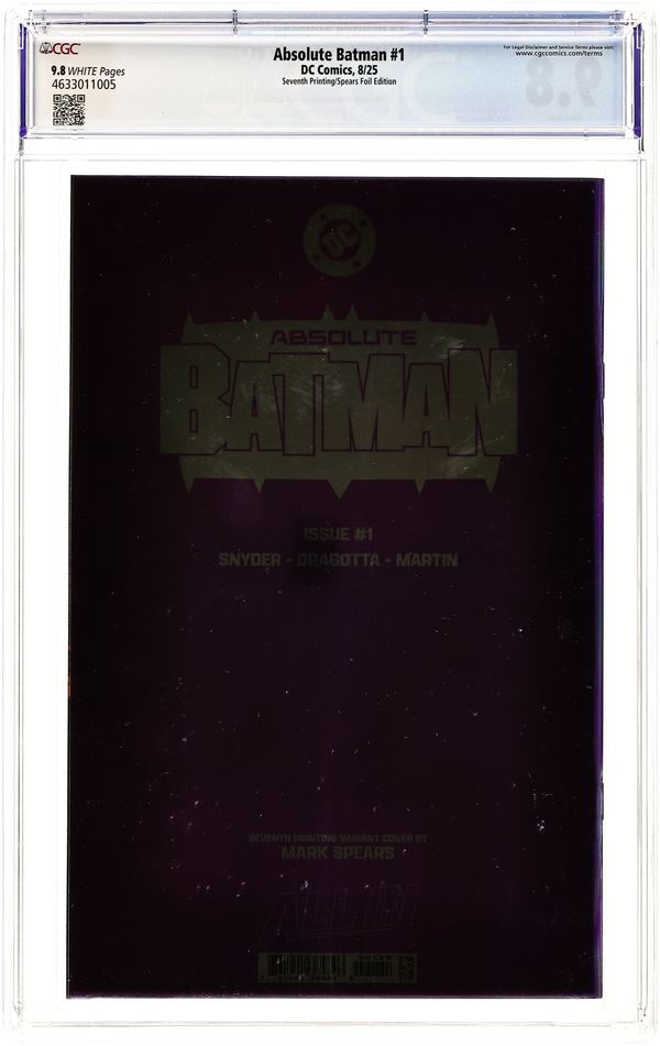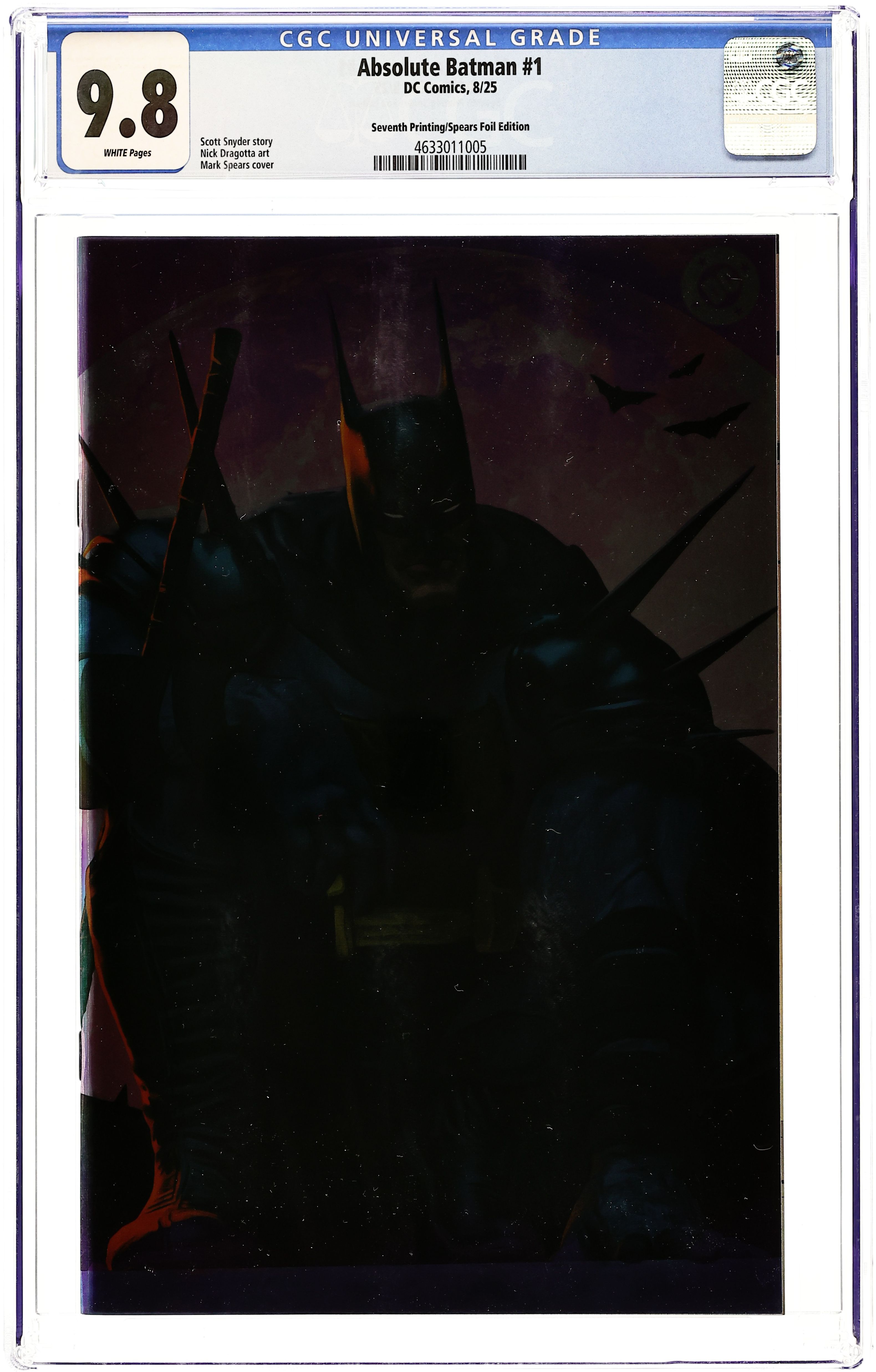 7th Printing, Cvr C. Foil Cover. Written by Scott Snyder. Art by Nick Dragotta. Cover by Mark Spears. BATMAN LEGEND SCOTT SNYDER AND ICONIC ARTIST NICK DRAGOTTA TRANSFORM THE DARK KNIGHT'S TALE FOR THE MODERN AGE! Without the mansion...without the money...without the butler...what's left is the Absolute Dark Knight! 48 pages, full color. Rated T+ Cover price $7.99.