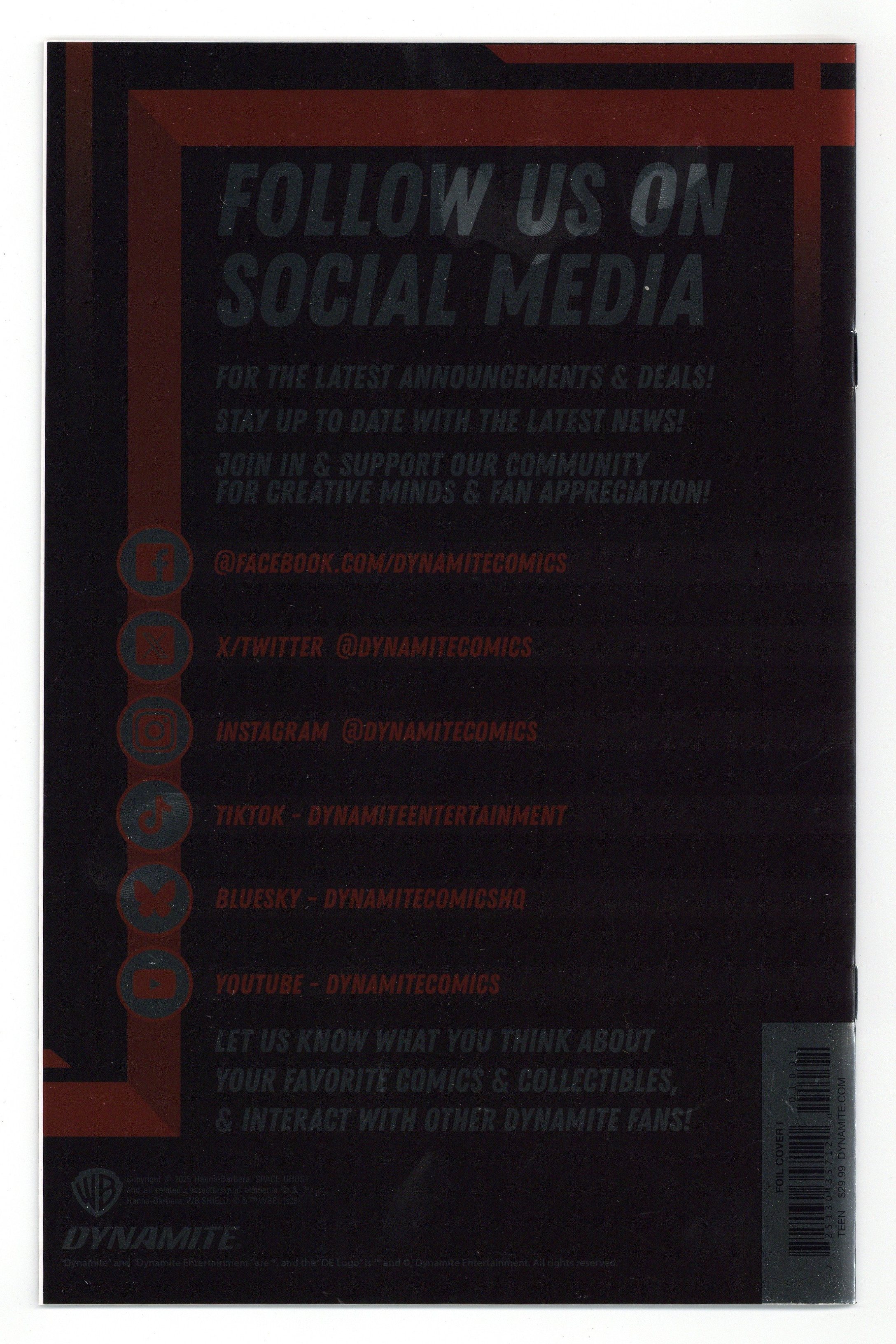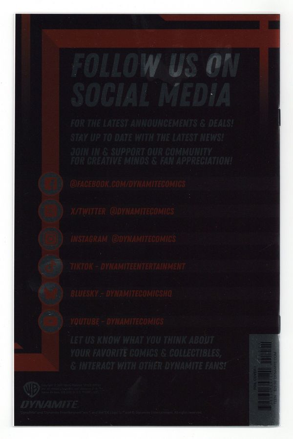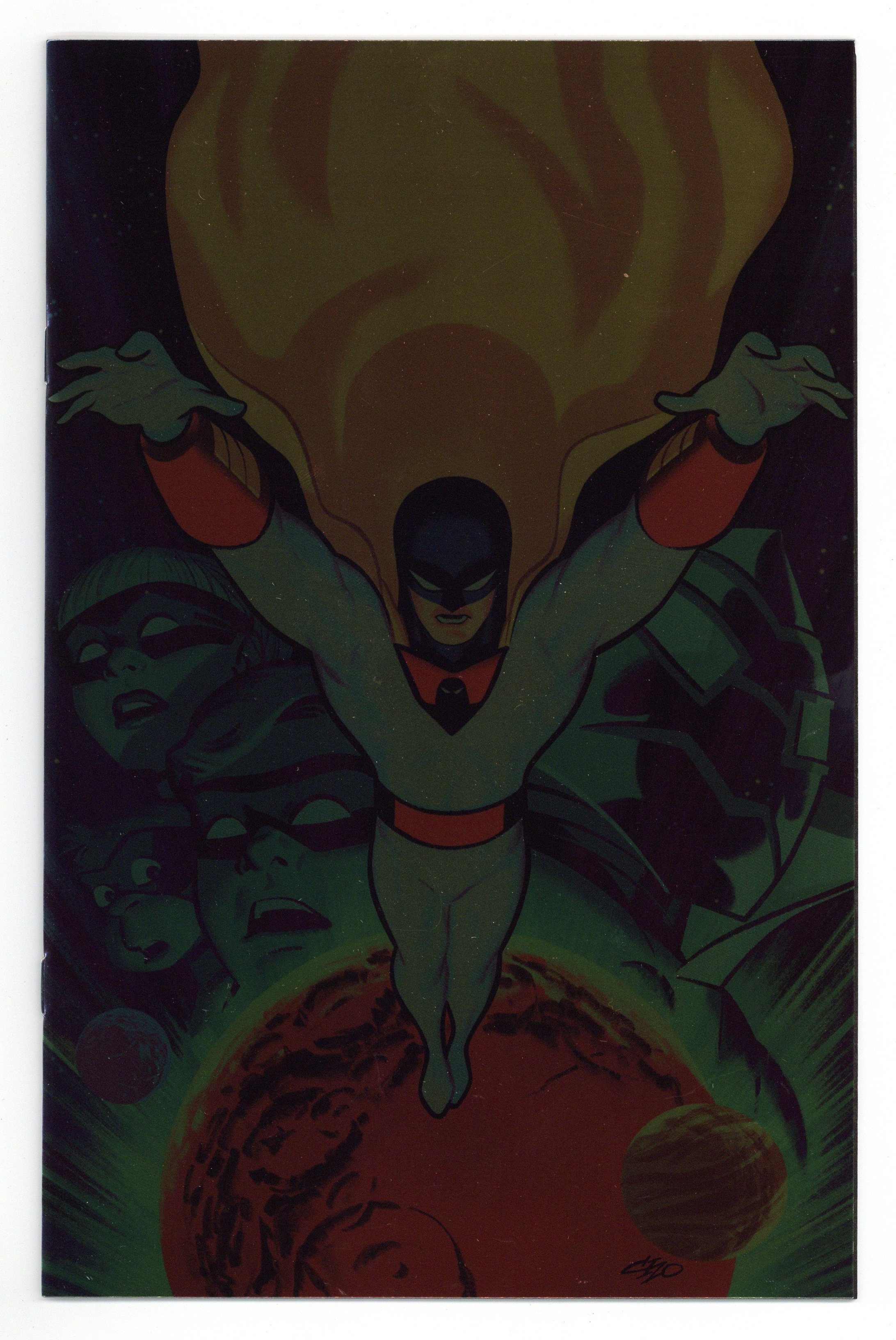 Published 2025 (est.) by Dynamite Entertainment.$35.99Virgin Foil Cover. Written by David Pepose. Art by Jonathan Lau. Cover by Michael Cho. A BRAND NEW YEAR OF ADVENTURES BEGINS HERE! The Guardian of the Spaceways returns for more evil-thwarting action in an all-new series - kicking off with the first appearance of a classic Space Ghost villain! As Space Ghost and Blip fight to defuse a hostage situation on an amusement park planet that's been hijacked by the villainous Toymaker, Jan and Jace are confronted by a mysterious figure from their past - a meeting that will shake the Ghost Planet's team to the core! Acclaimed author DAVID PEPOSE and visionary artist JONATHAN LAU reunite to reach for the stars in Space Ghost #1 - boosted by solid-fueled covers from FRANCESCO MATTINA, JAE LEE & JUNE CHUNG, BJORN BARENDS, and MICHAEL CHO! 32 pages, full color. Rated T Cover price $29.99.