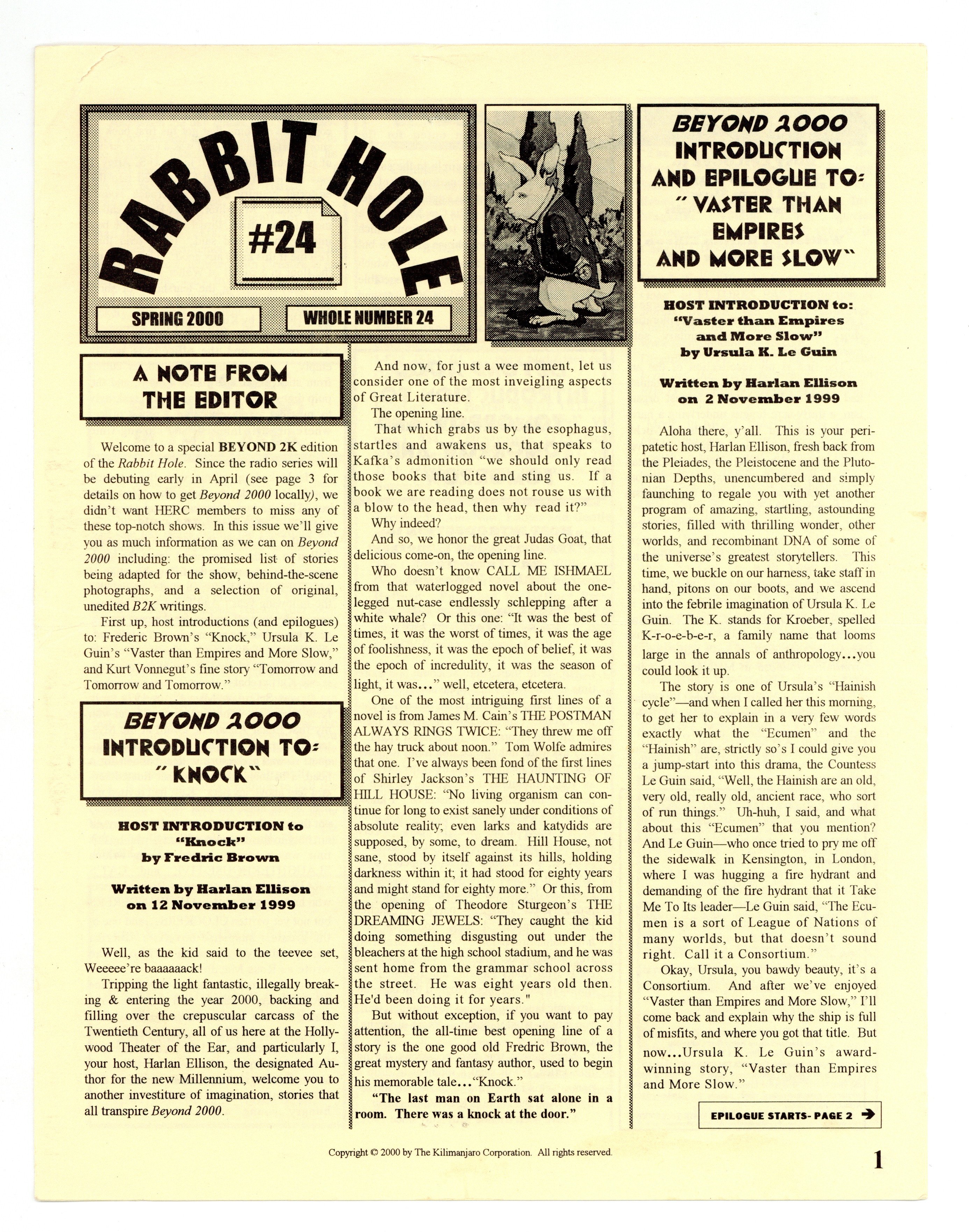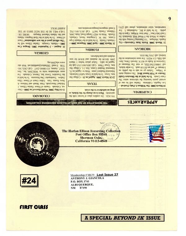 Published Mar 2000 by Kilimanjaro Corporation.$24.00Vol. 7, No. 1 - Whole Number 24. Spring 2000. Newsletter of The Harlan Ellison Record Collection. Originally created as a means to promote Harlan's audio recordings to his fans, it also gave him the opportunity to sell books from his back list, offer updates on projects, the occasional essay, scheduled appearances, publication schedules, and Harlan's ever present opinions on...everything. Is there consistency through the issues? Only in that they offer a relaxed review of All Things Ellison. 8.5" x 11", 6 pages, B&W Cover price $2.00.
