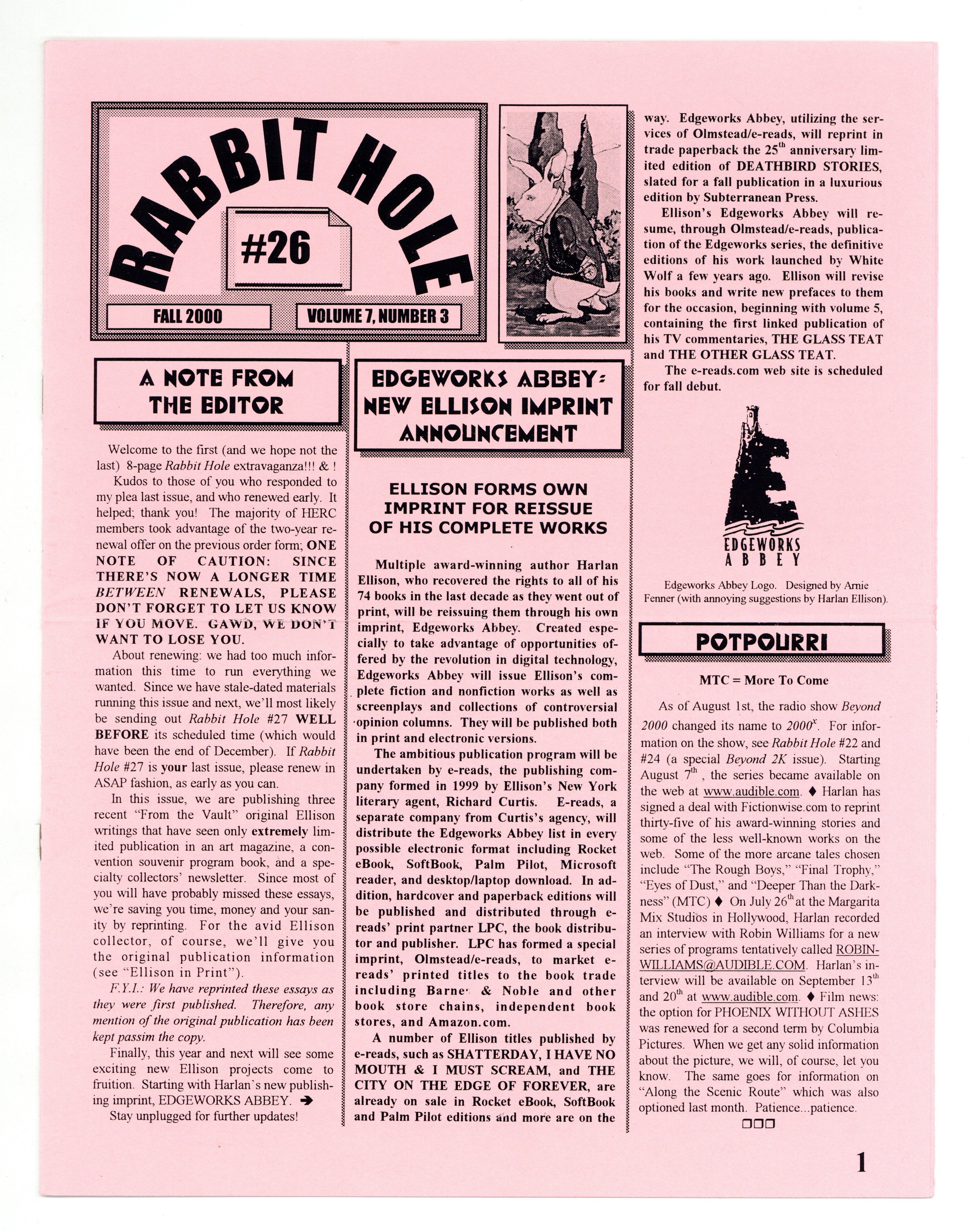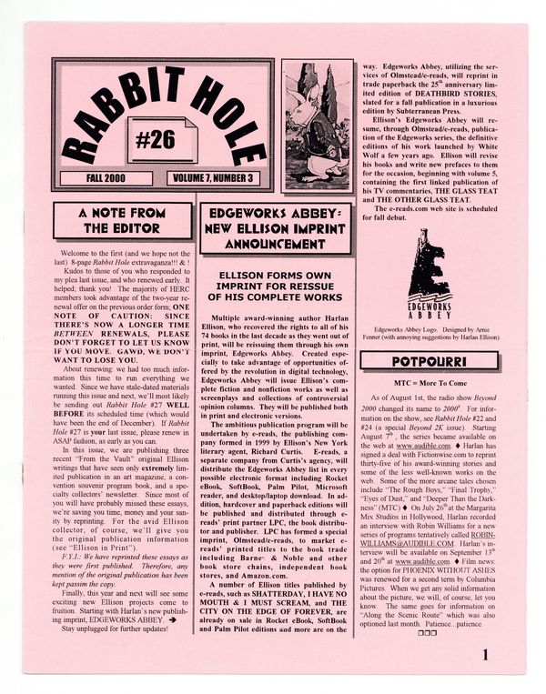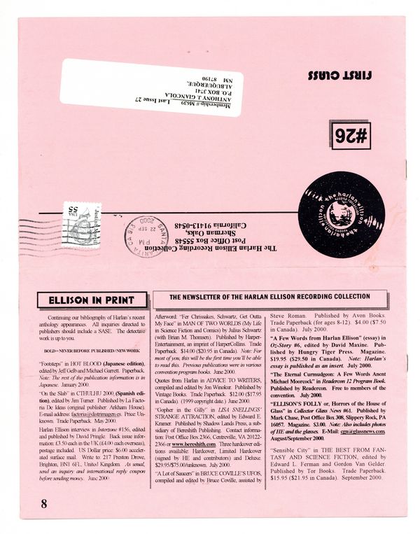 Published Sep 2000 by Kilimanjaro Corporation.$18.00Vol. 7, No. 3 - Whole Number 26. Fall 2000. Newsletter of The Harlan Ellison Record Collection. Originally created as a means to promote Harlan's audio recordings to his fans, it also gave him the opportunity to sell books from his back list, offer updates on projects, the occasional essay, scheduled appearances, publication schedules, and Harlan's ever present opinions on...everything. Is there consistency through the issues? Only in that they offer a relaxed review of All Things Ellison. 8.5" x 11", 8 pages, B&W Cover price $2.50.