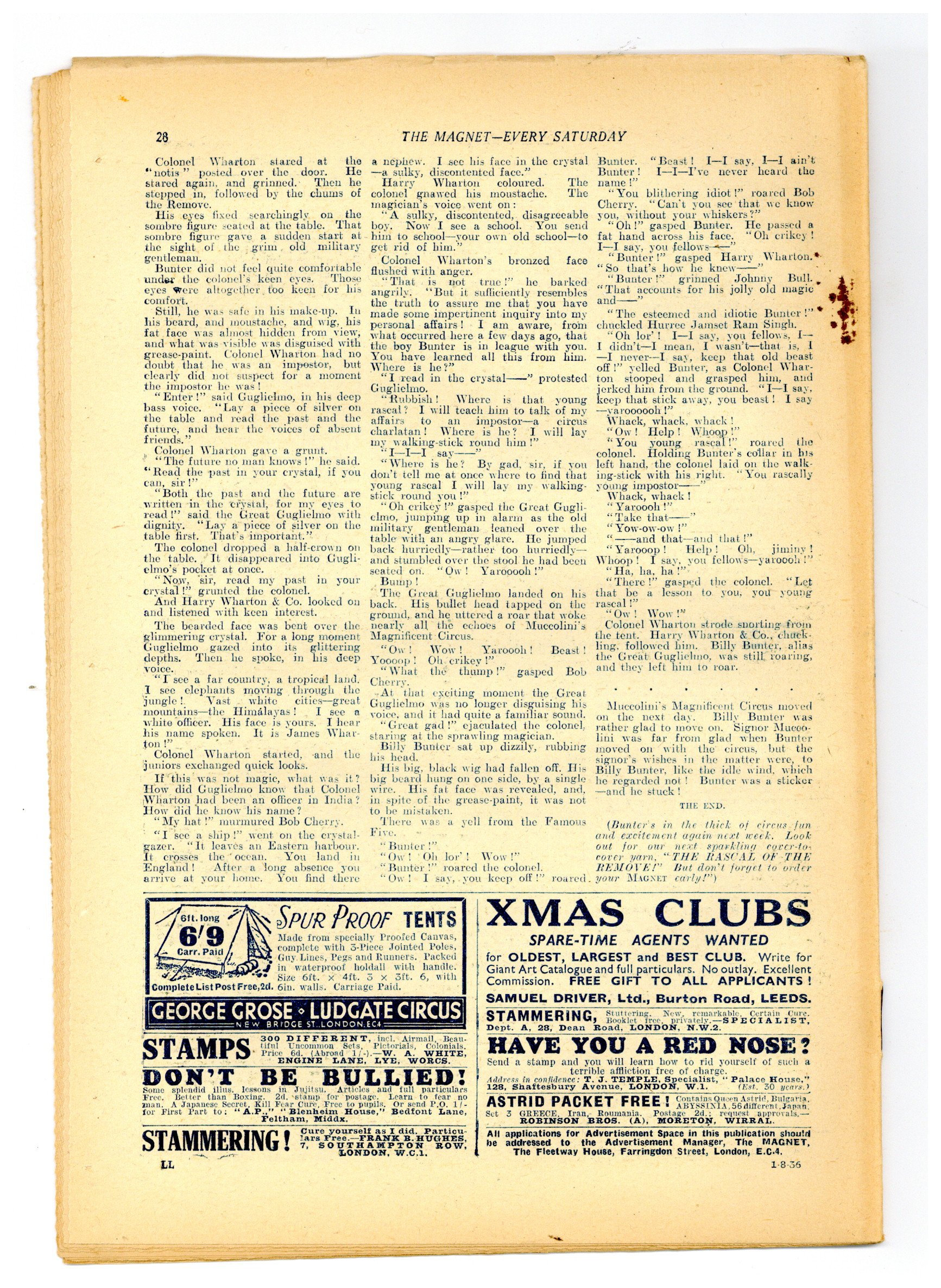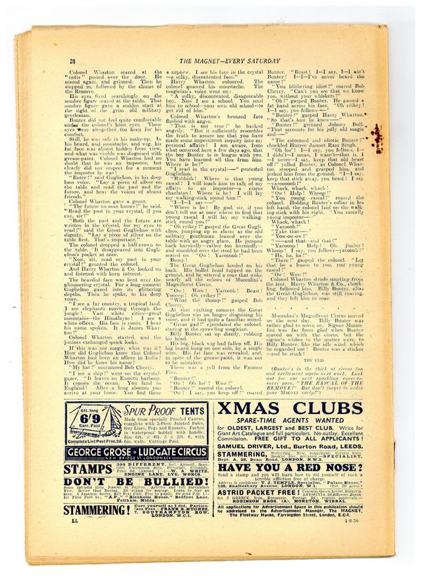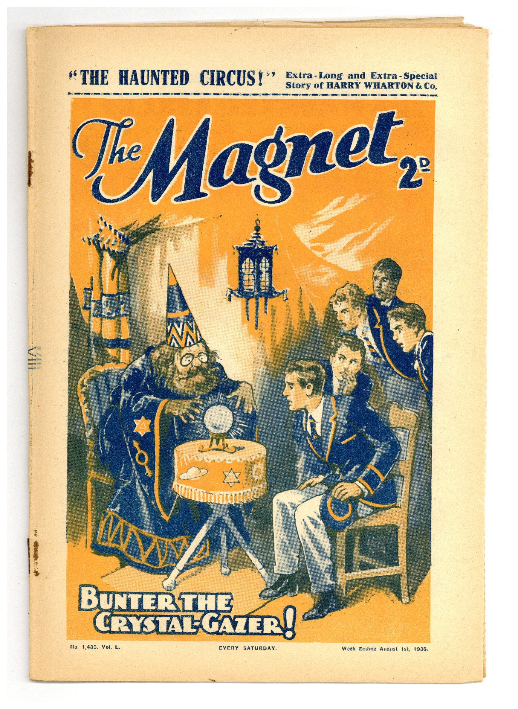 No. 1485 - August 01, 1936. Weekly British publication that ran for nearly 1,700 issues. Featured the anti-hero Billy Bunter of the Greyfriars School, along with serialized shorts. NOTE: This publication contains negative racial and cultural depictions. It reflects some attitudes of the era in which it was published that would not be acceptable today. 7.5" x 11", 28 pages, B&W.