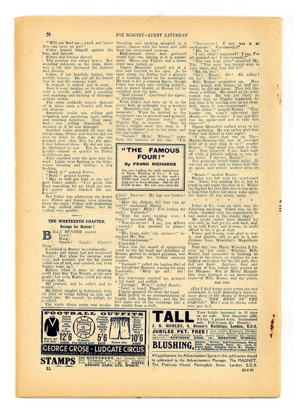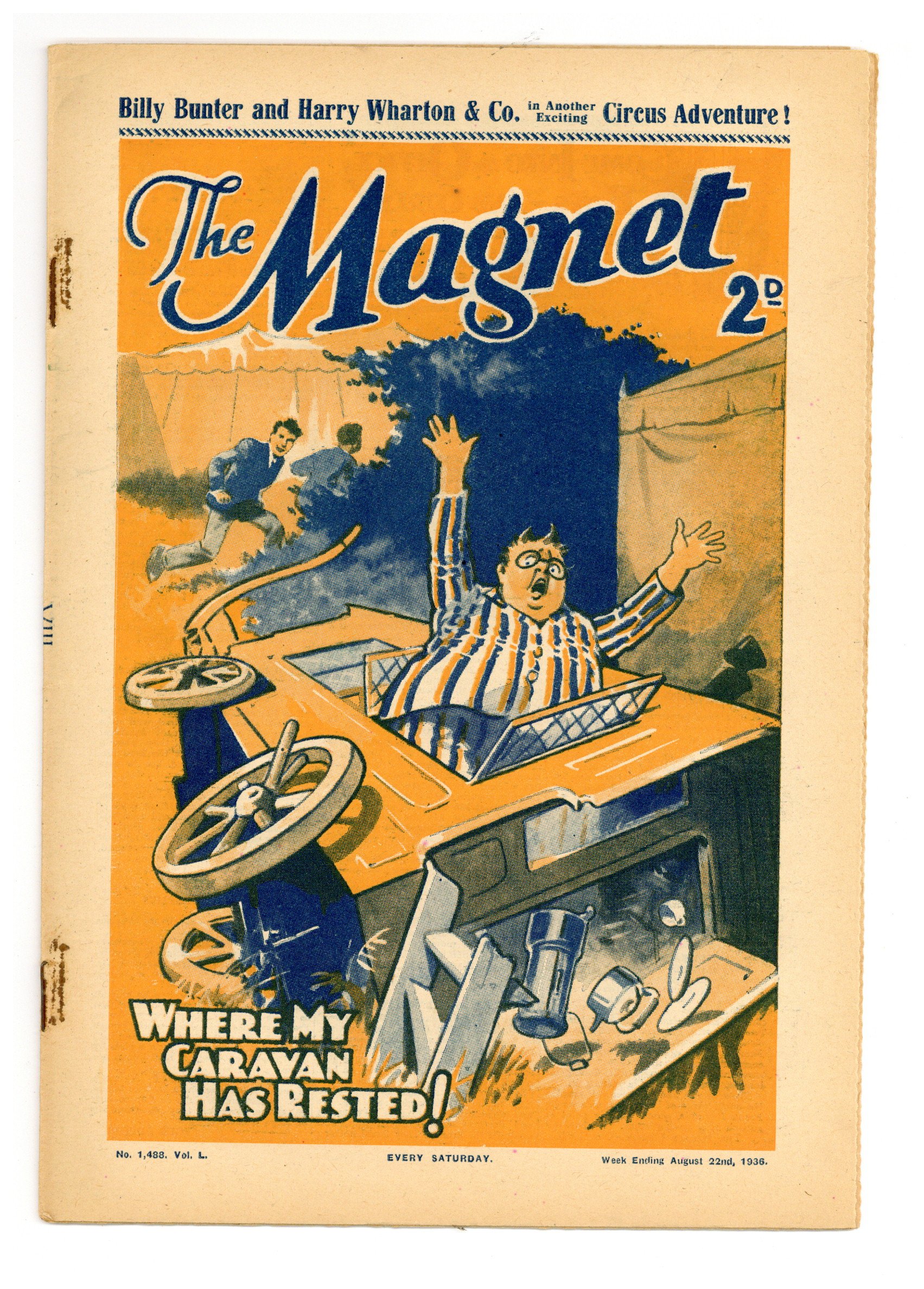 No. 1488 - August 22, 1936. Weekly British publication that ran for nearly 1,700 issues. Featured the anti-hero Billy Bunter of the Greyfriars School, along with serialized shorts. NOTE: This publication contains negative racial and cultural depictions. It reflects some attitudes of the era in which it was published that would not be acceptable today. 7.5" x 11", 28 pages, B&W.