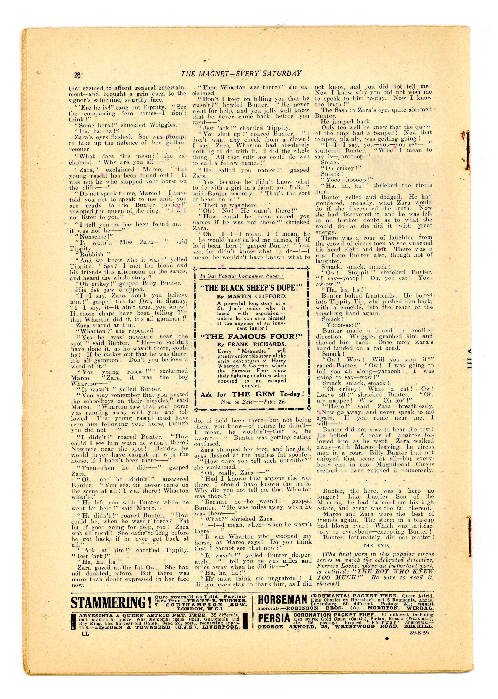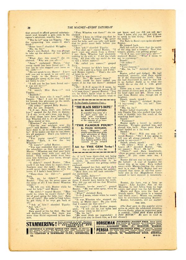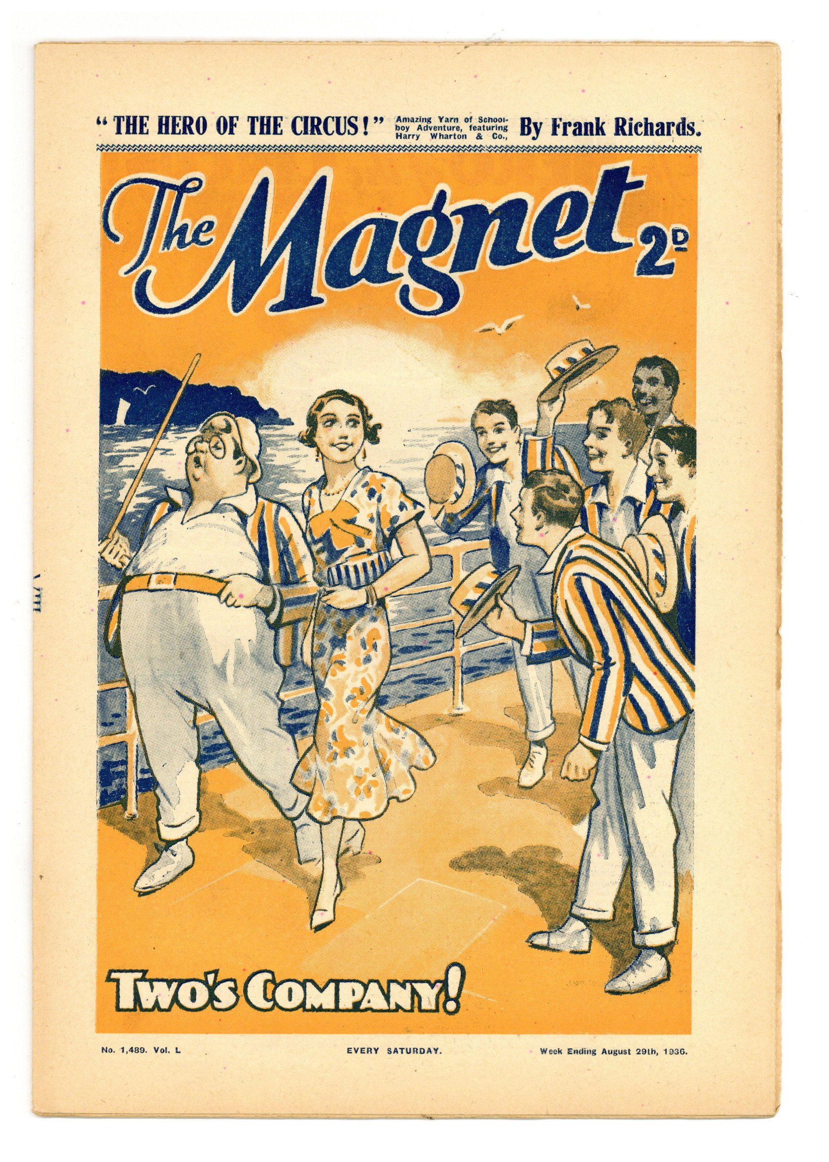 No. 1489 - August 29, 1936. Weekly British publication that ran for nearly 1,700 issues. Featured the anti-hero Billy Bunter of the Greyfriars School, along with serialized shorts. NOTE: This publication contains negative racial and cultural depictions. It reflects some attitudes of the era in which it was published that would not be acceptable today. 7.5" x 11", 28 pages, B&W.