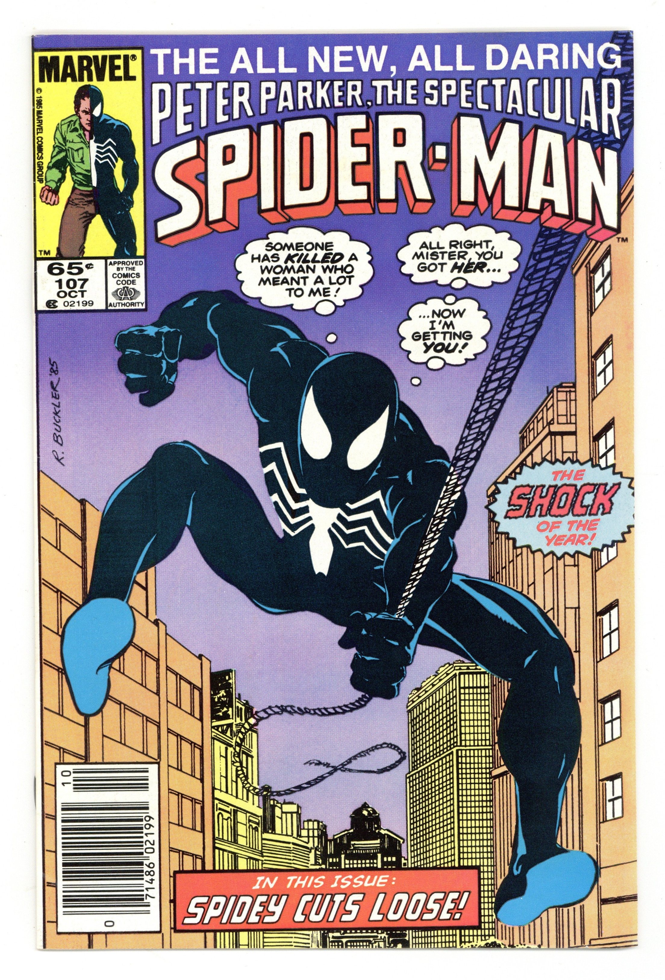 Newsstand Edition. "Original Sin" Part 1 of 4. Guest-starring Daredevil. Script by Peter David. Pencils by Rich Buckler. Inks by Brett Breeding. Cover by Rich Buckler. The critically acclaimed Death of Jean DeWolff storyline begins with this issue. In a stunning development, police captain Jean DeWolff is found murdered in her apartment. The entire city is in a state of shock over the killing including the police department, the staff at the Daily Bugle, and the Amazing Spider-Man. The web-slinger (in his black costume) begins investigating the homicide by meeting with the detective assigned to the case, Stan Carter. However, another superhero, Daredevil, gets the first shot at stopping the murderous rampage of the Sin-Eater! First appearance of the Sin-Eater. 32 pages Cover price $0.65.