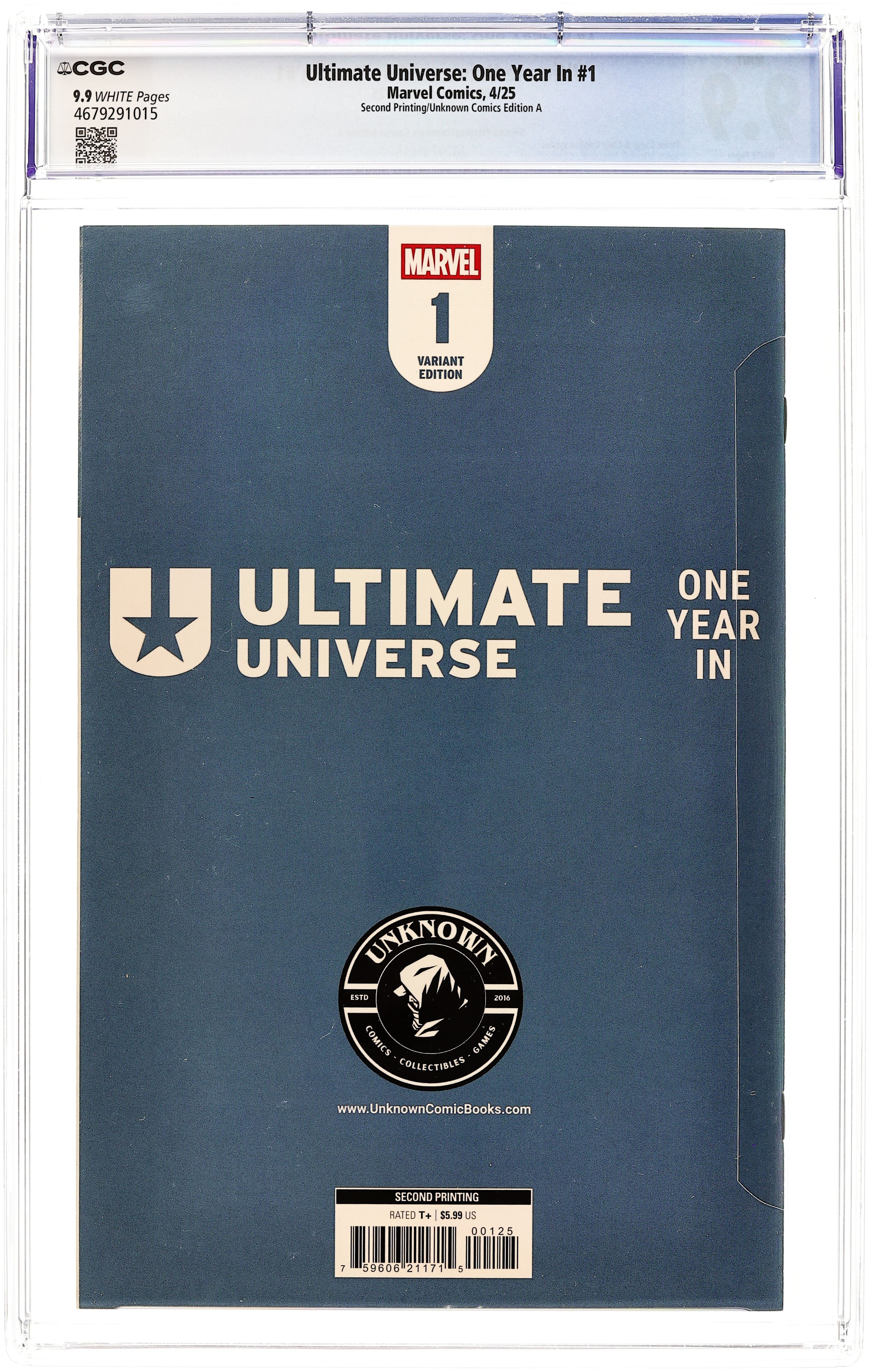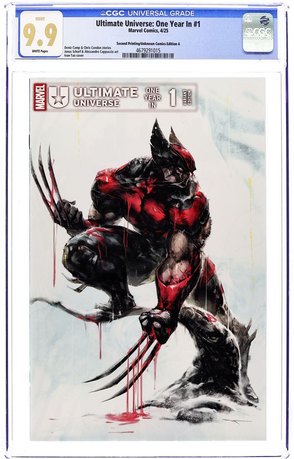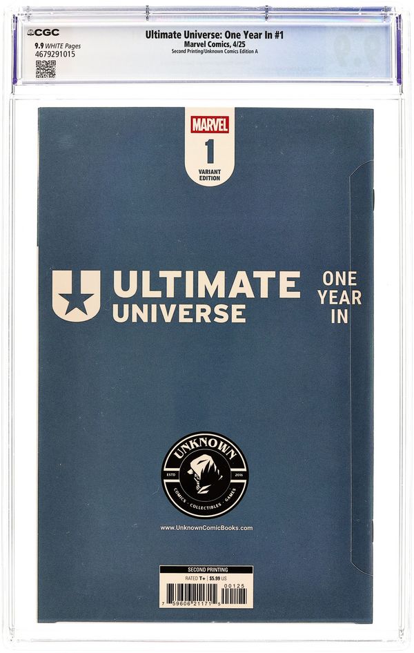 Second Printing. Unknown Comic Books Exclusive Variant Cover by Ivan Tao. Written by Deniz Camp; Christopher Condon. Art by Jonas Scharf; Alessandro Cappuccio. THE CLOCK IS TICKING DOWN TO THE MAKER'S ARRIVAL! Deniz Camp flips the narrative on ULTIMATES and takes us inside the Maker's Council! The heroes of the Ultimate Universe aren't the only ones who have been preparing for the return of the Maker, and the clock is ticking down… This unique one-shot sets the stage for the second year of the Ultimate line and includes the debut of the Ultimate versions of two major Marvel characters! 40 pages, full color. Rated T+ Cover price $5.99.