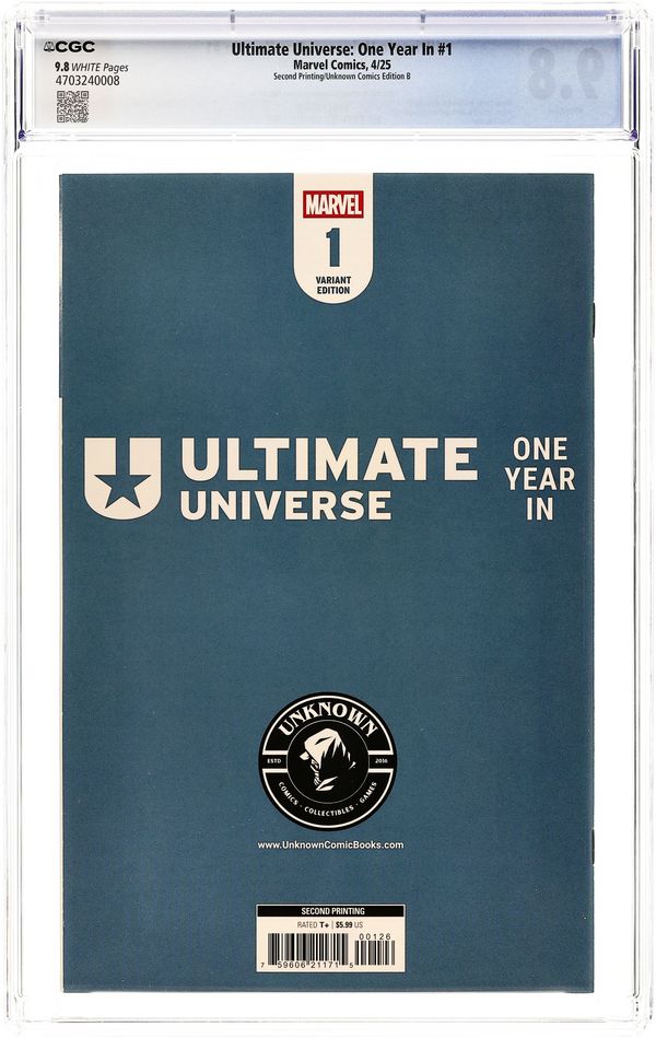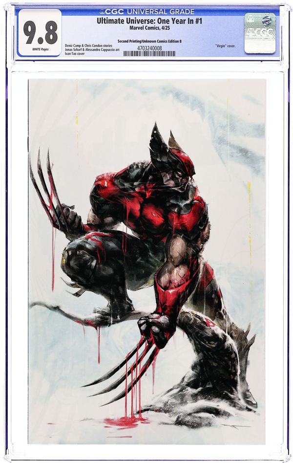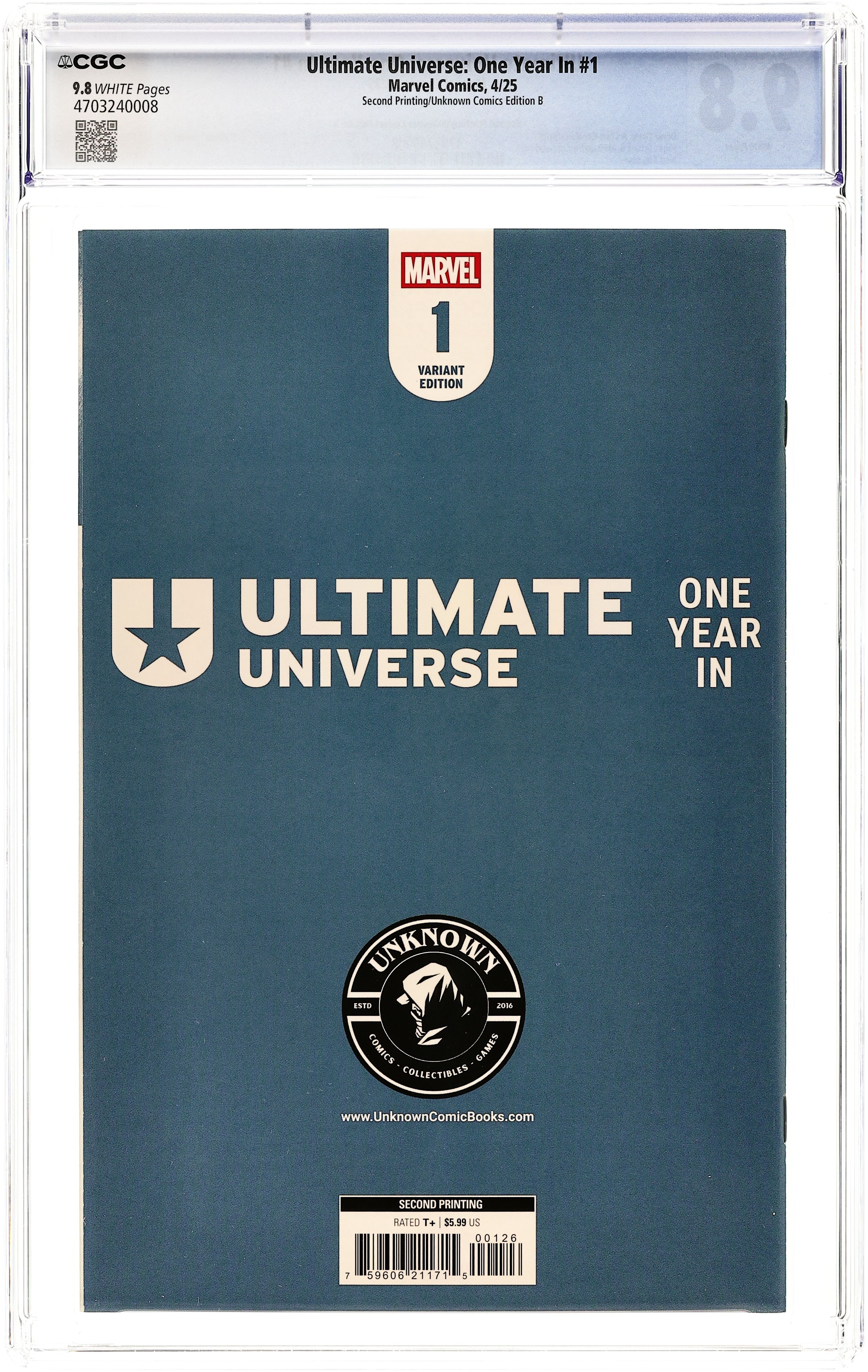 Second Printing. Unknown Comic Books Exclusive Virgin Cover by Ivan Tao. Written by Deniz Camp; Christopher Condon. Art by Jonas Scharf; Alessandro Cappuccio. THE CLOCK IS TICKING DOWN TO THE MAKER'S ARRIVAL! Deniz Camp flips the narrative on ULTIMATES and takes us inside the Maker's Council! The heroes of the Ultimate Universe aren't the only ones who have been preparing for the return of the Maker, and the clock is ticking down… This unique one-shot sets the stage for the second year of the Ultimate line and includes the debut of the Ultimate versions of two major Marvel characters! 40 pages, full color. Rated T+ Cover price $5.99.