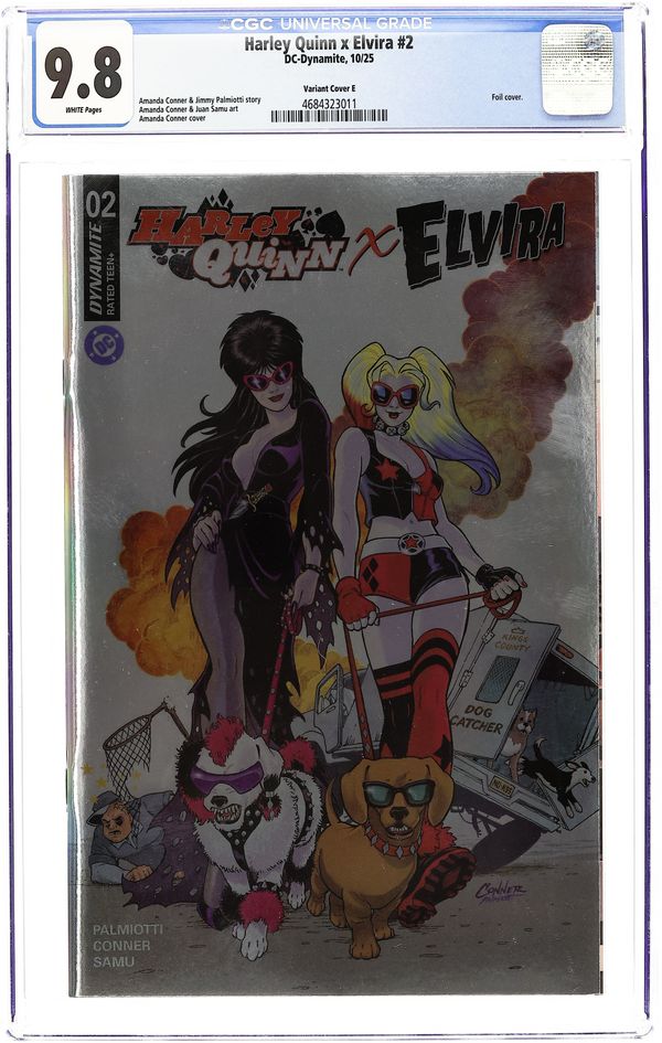 Foil Cover. (W) Amanda Conner, Jimmy Palmiotti (A) Amanda Conner, Juan Samu (CA) Amanda Conner When Elvira first met Harley Quinn, the Mistress of the Dark was desperate for any plan that could help her save her beloved TV show after it was threatened with cancellation by heartless corporate raiders. Well, the Clown Princess of Crime came up with a plan, all right, and now Elvira is along for the ride no matter how crazy Harley's scheme turns out to be! Putting together the biggest Halloween block party ever staged is a great idea in theory, but pulling it off means raising a massive amount of money and a pile of cash that big is sure to draw the attention of every thug and delinquent in the Tri-State area. If Harley and Elvira want to keep their party funds secure, they're going to have to become too big to fail and that means going international! Famed Harley Quinn Whisperers AMANDA CONNER and JIMMY PALMIOTTI double down on the year's most hotly anticipated crossover in Harley Quinn X Elvira #2, with Conner providing two captivating covers as well as several story pages to accompany artist JUAN SAMU's interiors-all capped off by indecently alluring covers from JOSEPH MICHAEL LINSNER, CHAD HARDIN, and BEN CALDWELL! 32 pages, full color, rated teen+. Cover price $9.99.