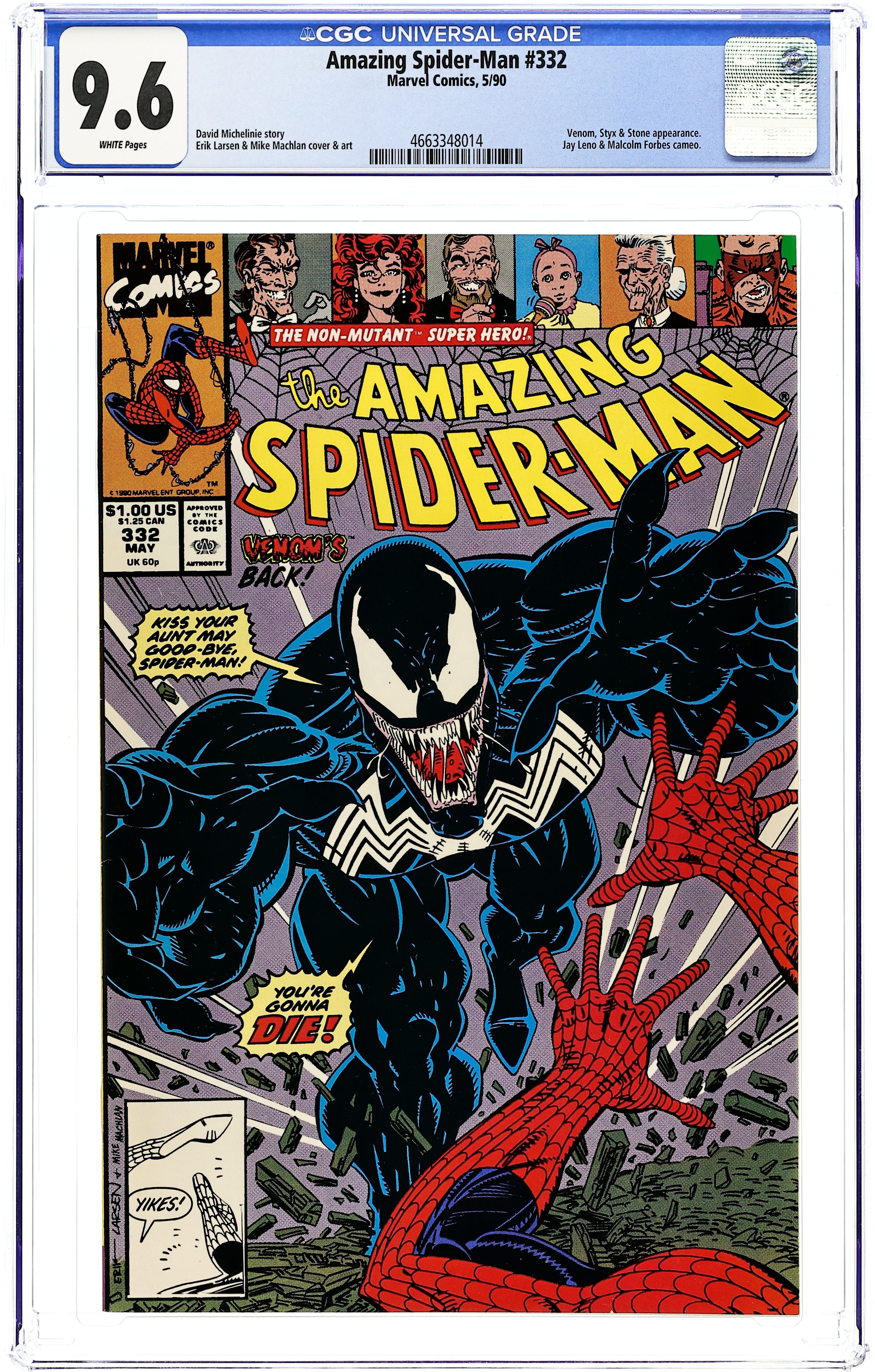 Direct Edition. "Sunday in the Park with Venom" Part 1 of 2. Script by David Michelinie. Pencils by Erik Larsen. Inks by Mike Machlan, Jack Abel, Keith Wilson, Keith Williams, Brad Vancata, Joe Rosas, and Mickey Ritter. Cover by Erik Larsen and Mike Machlan. The web-slinger's worst nightmare is back again! Venom! And so is Mary Jane's! Jonathan Caesar! Add Styx and Stone to the volatile mix and the Parkers are in for a very rough day! The Amazing Spider-Man battles the psychotic Venom in Central Park, while Mary Jane confronts the deranged Caesar at Bedford Towers! Could the wall-crawler and his wife score a double victory against their respective nemeses? Mary Jane has a chance; Spider-Man not so much. Cameo appearances by Aunt May, Jimmy Olsen, Jay Leno, and Malcolm Forbes. (Note: The letters page contains a statement of ownership: average print run 426,790; average paid circulation 266,100.) 36 pages. Cover price $1.00.