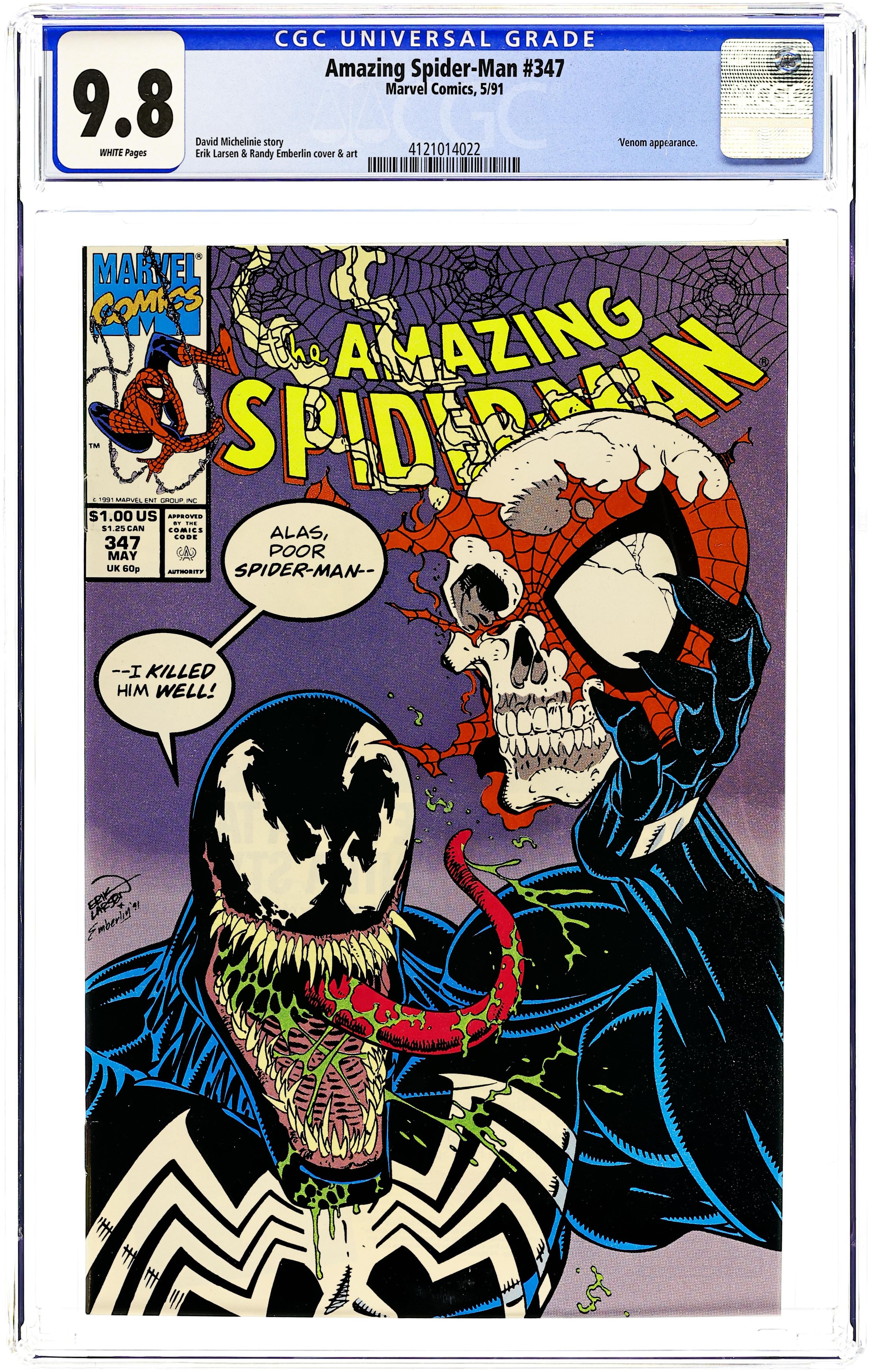 Tags: Marvel Legacy Numbering: Amazing Spider-Man (part 347), Spider-Man$26.00Direct Edition. "The Boneyard Hop!" Part 2 of 2. Script by David Michelinie. Pencils by Erik Larsen. Inks by Randy Emberlin. Cover by Erik Larsen and Randy Emberlin. On a deserted island, the Amazing Spider-Man wages a desperate battle for survival vs. the vicious Venom! The wall-crawler is fighting for his life! While Venom is fighting for his death! And this time there isn't any help or rescue on the way! As shown on the twisted cover, Venom plans to quote Hamlet once the battle is over! If the spectacular one doesn't want to play the part of Yorick; he better move fast! To thine own self be true, web-slinger! Cameo appearances by Mary Jane Watson, Willie Lumpkin, Aunt May, Flash Thompson, and the Black Cat. (Notes: Venom appears next in Darkhawk 13 & 14. This two-part story was reprinted in the trade paperbacks: Spider-Man: Venom Returns (1993) and Spider-Man: The Vengeance of Venom (2011).) 36 pages. Cover price $1.00. Cover price $1.00.
