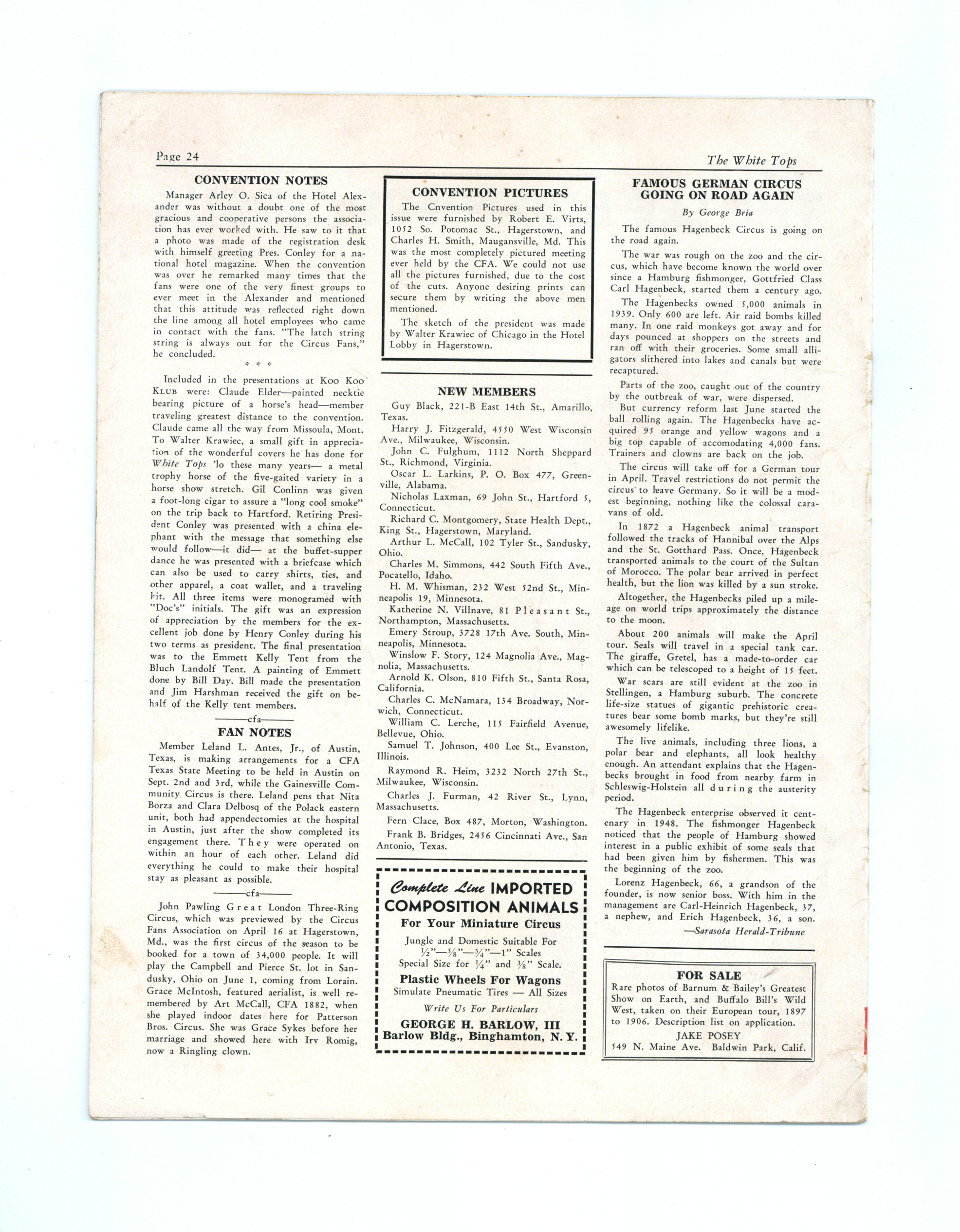 Vol. 22, No. 5/6 - May/June 1949. "White Tops" is the official magazine of the CFA and keeps the circus industry connected with news, articles and history and is sent to members four times per year. 8" x 10.5", 24 pages, B&W. Cover price $0.35.