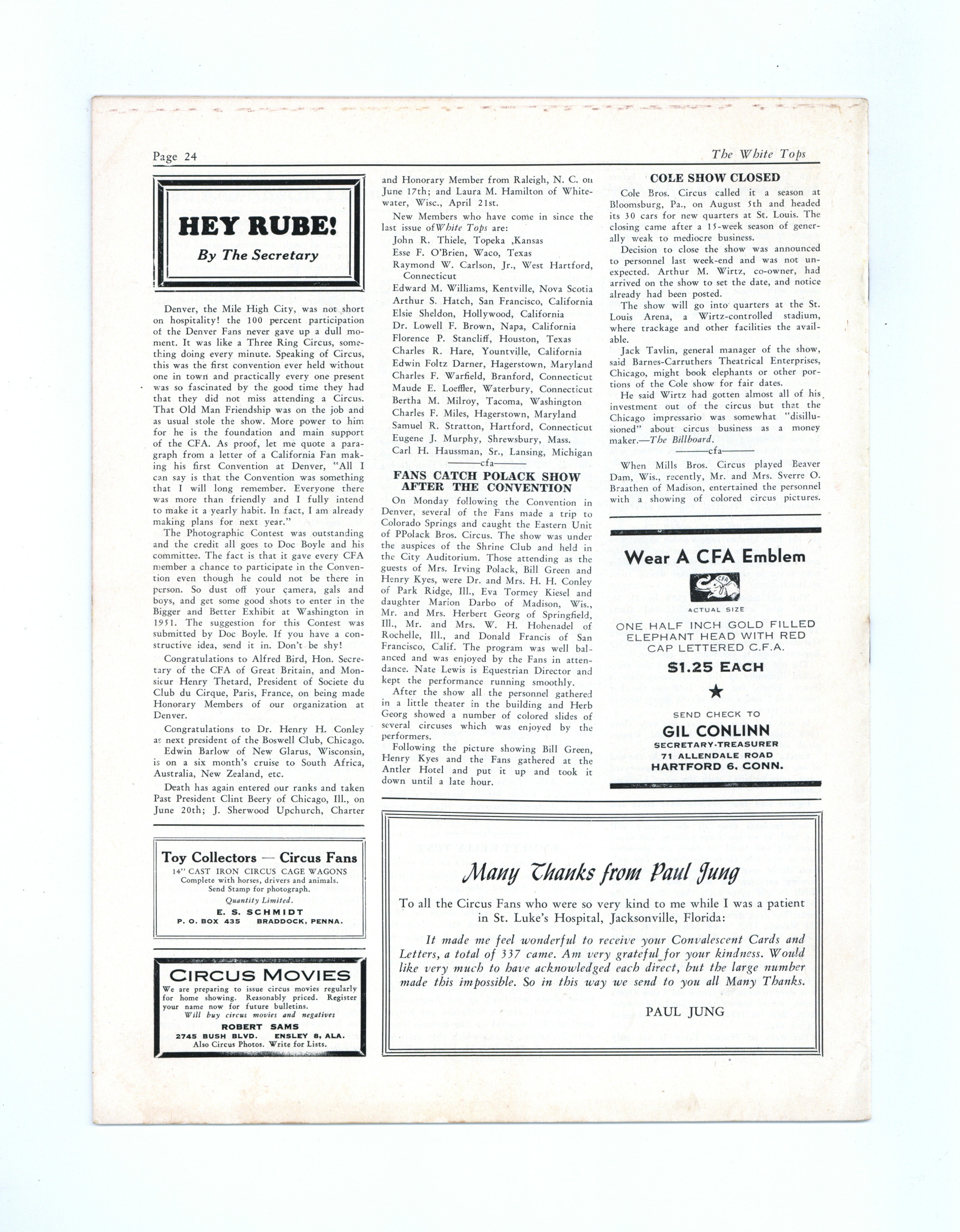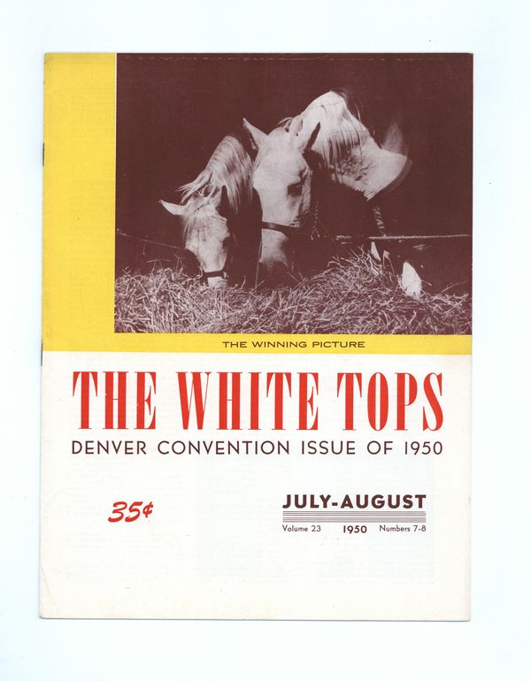 Vol. 23, No. 7/8 - July/August 1950. "White Tops" is the official magazine of the CFA and keeps the circus industry connected with news, articles and history and is sent to members four times per year. 8" x 10.5", 24 pages, B&W. Cover price $0.35.