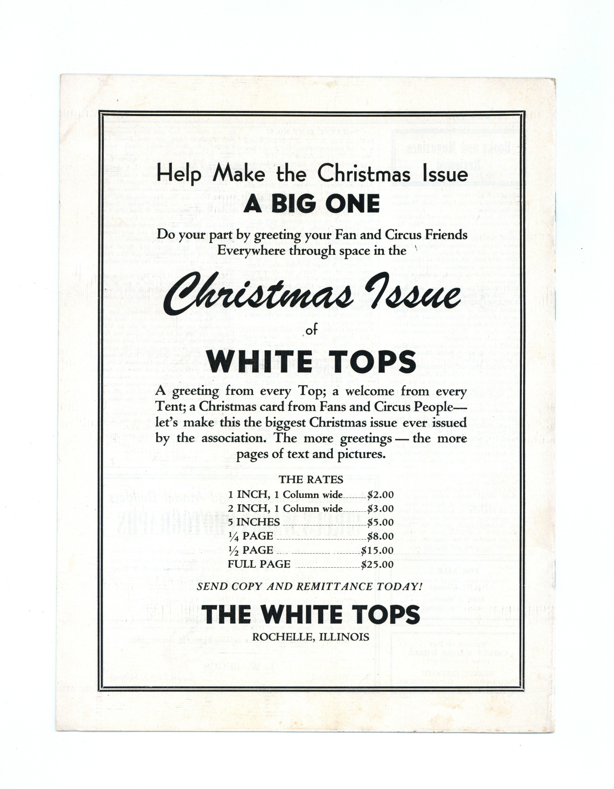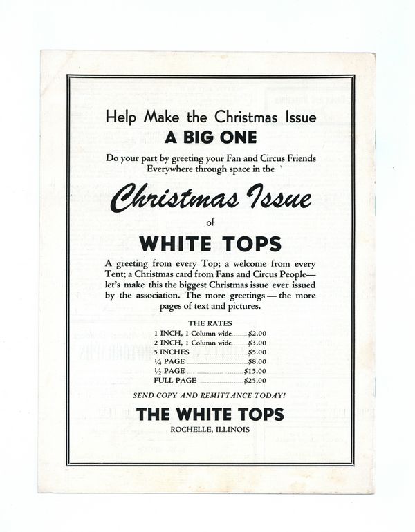 Vol. 23, No. 9/10 - September/October 1950. "White Tops" is the official magazine of the CFA and keeps the circus industry connected with news, articles and history and is sent to members four times per year. 8" x 10.5", 16 pages, B&W. Cover price $0.35.