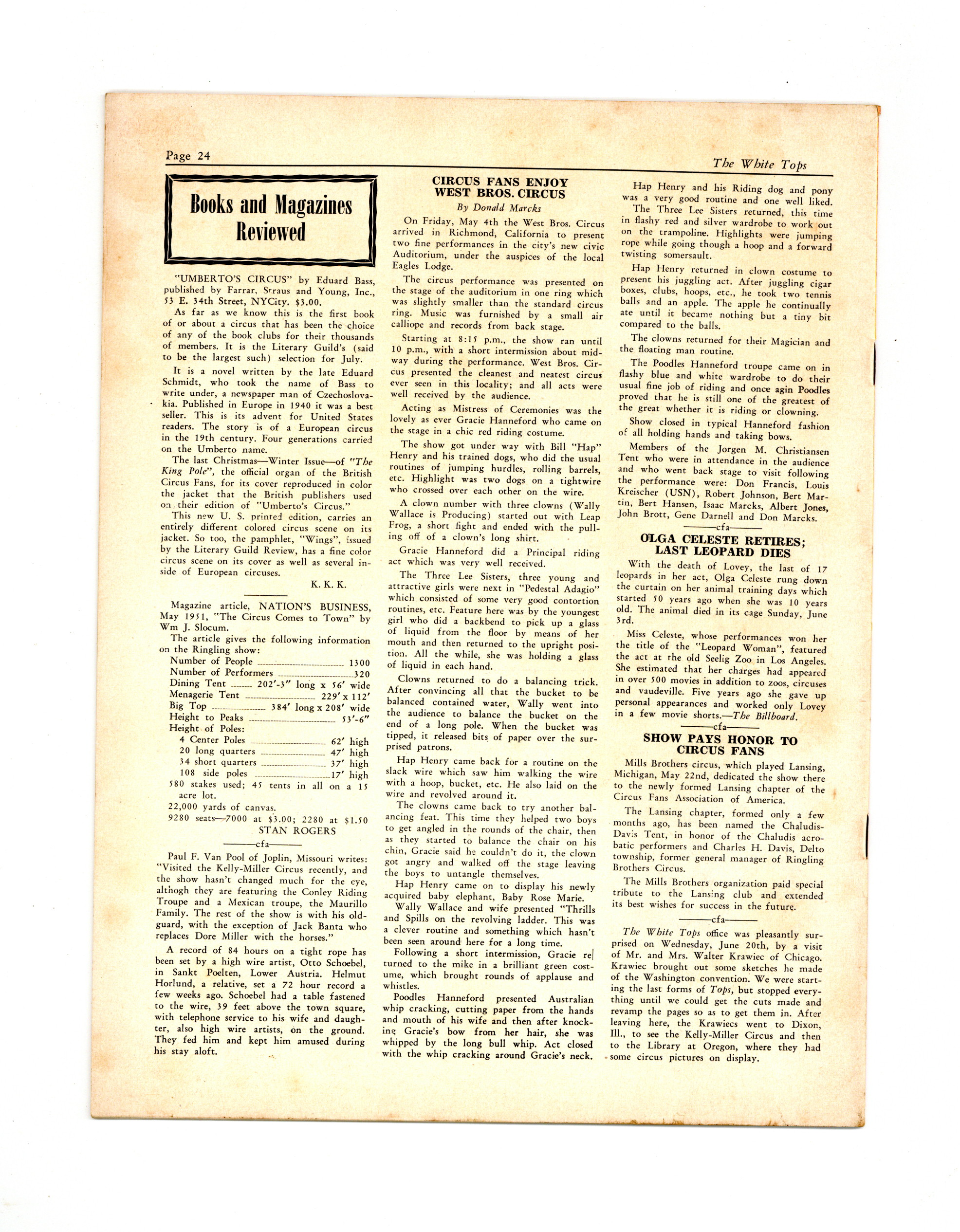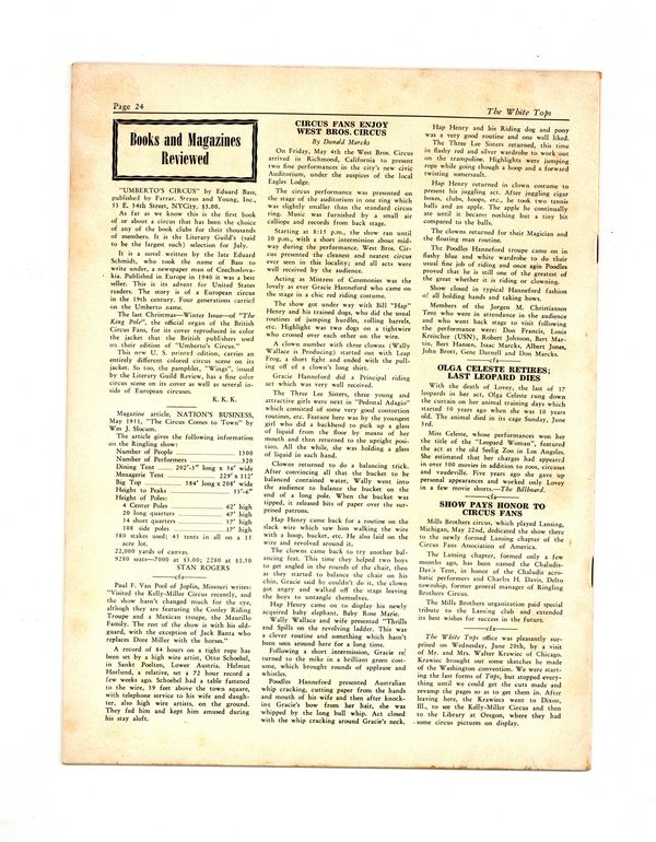 Vol. 24, No. 5/6 - May/June 1951. "White Tops" is the official magazine of the CFA and keeps the circus industry connected with news, articles and history and is sent to members four times per year. 8" x 10.5", 24 pages, B&W. Cover price $0.35.