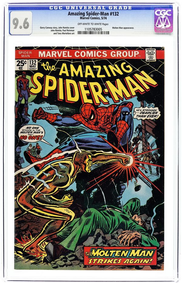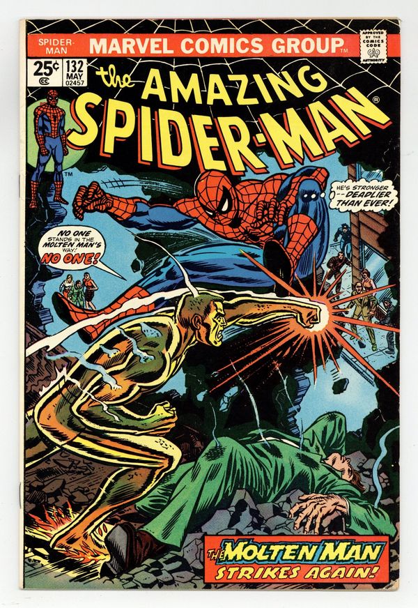 Tags: Marvel Legacy Numbering: Amazing Spider-Man (part 132), Spider-Man$18.50"The Master Plan of the Molten Man!" Part 1 of 2. Script by Gerry Conway. Pencils by John Romita and Paul Reinman. Inks by Paul Reinman, Tony Mortellaro (backgrounds), and John Romita (alterations). Cover by Gil Kane and John Romita. On the Upper East Side, Peter Parker bumps into an old acquaintance: Liz Allan. Whoa, where has she been since high school (and Amazing Spider-Man #30)? A few hours later inside a run-down tenement, the web-slinger bumps into an old enemy: the Molten Man! Where has he been since Amazing Spider-Man #35? Is it possible that both their returns are somehow connected? Ned Leeds and Mary Jane Watson will work to answer that question, while the wall-crawler tries to stay cool against his fiery foe! Cameo appearances by Betty Brant and Joe Robertson. First 25¢ cover. (Notes: This issue includes an ad for Marvel's new Deadly Hands of Kung Fu (1974) magazine. The letters page contains Marvel Value Stamp series A #6 Thor by John Buscema and Mike Esposito. The letters page also includes a statement of ownership: average print run 541,043; average paid circulation 273,204. This issue was reprinted in Marvel Tales 109.) 32 pages. Cover price $0.25.
