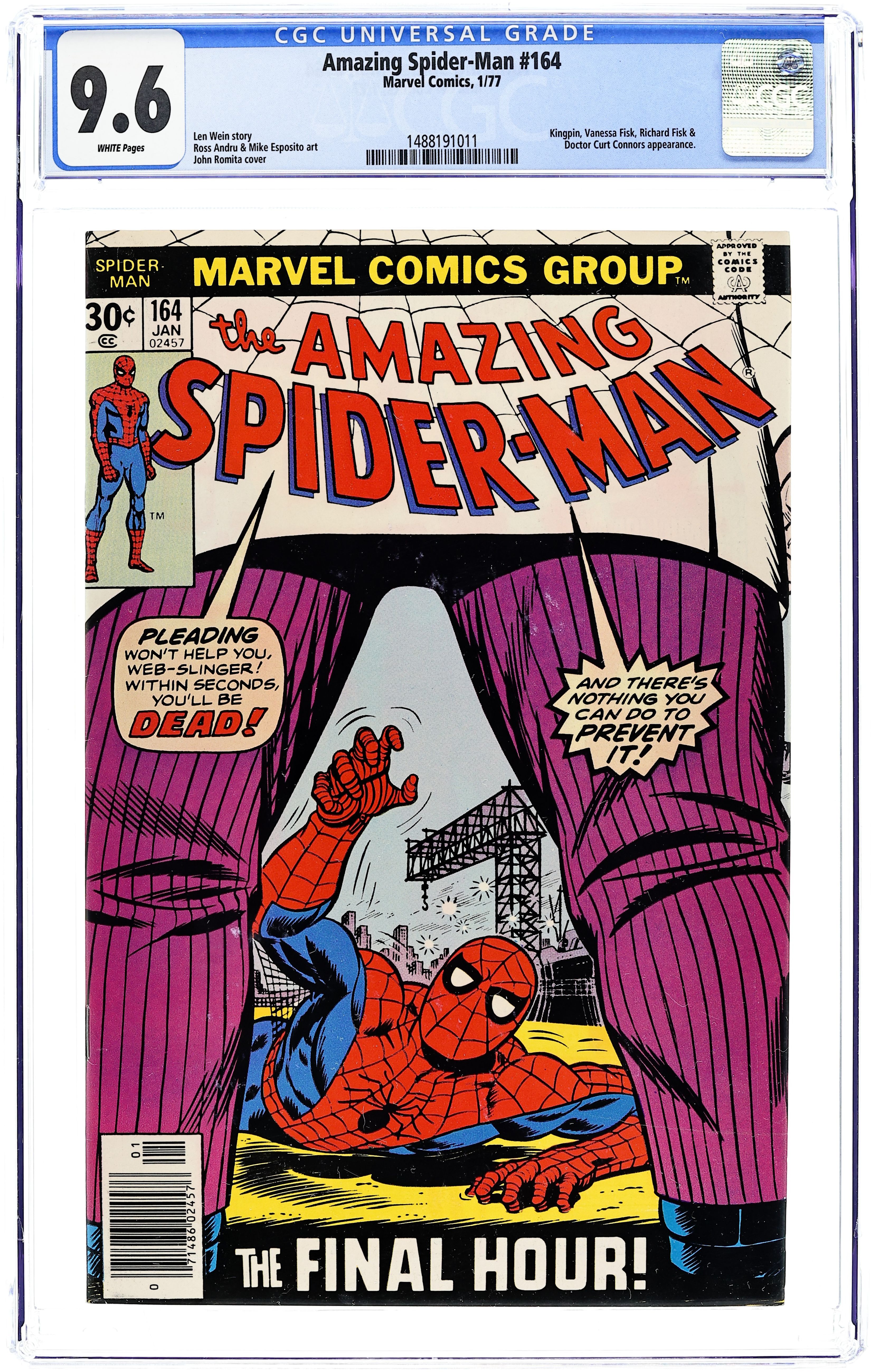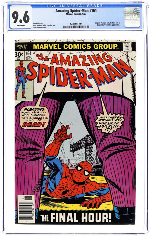Tags: Marvel Legacy Numbering: Amazing Spider-Man (part 164), Spider-Man$30.00"Deadline!" Part 2 of 2. Script by Len Wein. Art by Ross Andru (breakdowns), Mike Esposito (finishes), and Dave Hunt (backgrounds). Cover by John Romita. In surprising fashion, the Kingpin's bizarre plan works! Richard Fisk absorbs the web-slingers life force and regains consciousness! So what's left of the amazing one? He's become dead (spider) man walking! However the wall-crawler musters enough strength to reach Dr. Curt Connors' laboratory; and once inside he receives a temporary energy boost! Armed with a device to recover his life force, the Spectacular Spider-Man sets off to find the Big Apple crime boss and his son! At the Brooklyn Navy Yard, the web-slinger rendezvous with the Kingpin of Crime! Who will survive their donnybrook on the docks? A powerful ending! Cameo appearances by Vanessa Fisk and Glory Grant. Flashback cameos by Captain America, the Falcon, and Red Skull. (Notes: The Kingpin returns in Amazing Spider-Man 197. Ross Andru's detailed illustrations of the navy yard were praised in the letters page of Amazing Spider-Man 168.) 36 pages. Cover price $0.30.