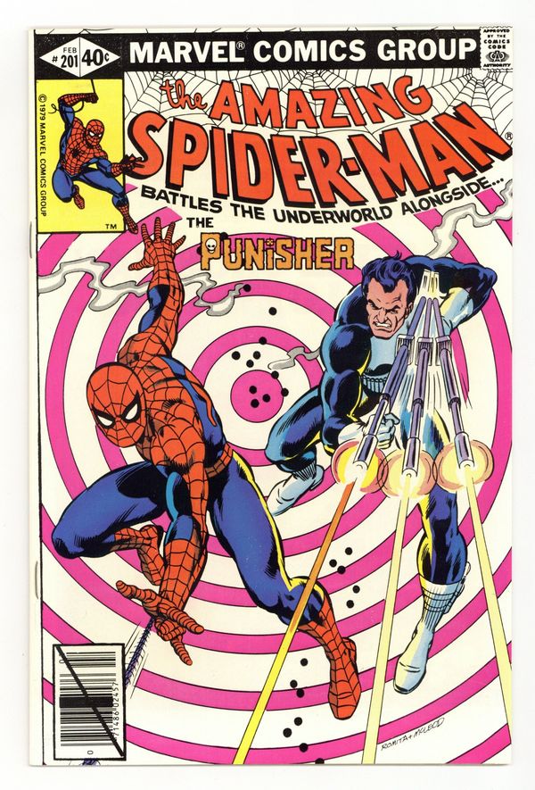 Tags: Marvel Legacy Numbering: Amazing Spider-Man (part 201), Spider-Man$43.50Direct Edition. "Man-Hunt!" Part 1 of 2. Guest-starring the Punisher. Script by Marv Wolfman. Art by Keith Pollard (layouts) and Jim Mooney (finishes). Cover by John Romita and Bob McLeod. The action starts with a bang as the web-slinger catches a man falling out of a high-rise office building! When Spider-Man swings inside to investigate, he discovers the source of the problem: the Punisher! What has Frank Castle been up to since Spidey last saw him (in Amazing Spider-Man 175)? Oh, just business as usual...terrorizing the underworld! The following day to his surprise, the Punisher sees pictures of his penthouse gun battle in the Daily Globe! Credited to a photographer named Peter Parker! This troubles the Punisher! And that means trouble for Aunt May's nephew! War Journal Entry #519 is coming up next at a particular superhero's Chelsea apartment! Appearances by J. Jonah Jameson, Joe Robertson, Dr. Marla Madison, Aunt May, and Mary Jane Watson. (Notes: The Punisher previously appeared in Captain America 241. Mary Jane appears next in the classic Marvel Team-Up 79 where (as Red Sonja) she battles Kulan Gath alongside the web-slinger. This is one of Mary Jane's very few appearances between 1979 and 1983. She returns to the Amazing Spider-Man title in issue 238. This story was reprinted in Marvel Tales 218.) 36 pgs. Cover price $0.40.