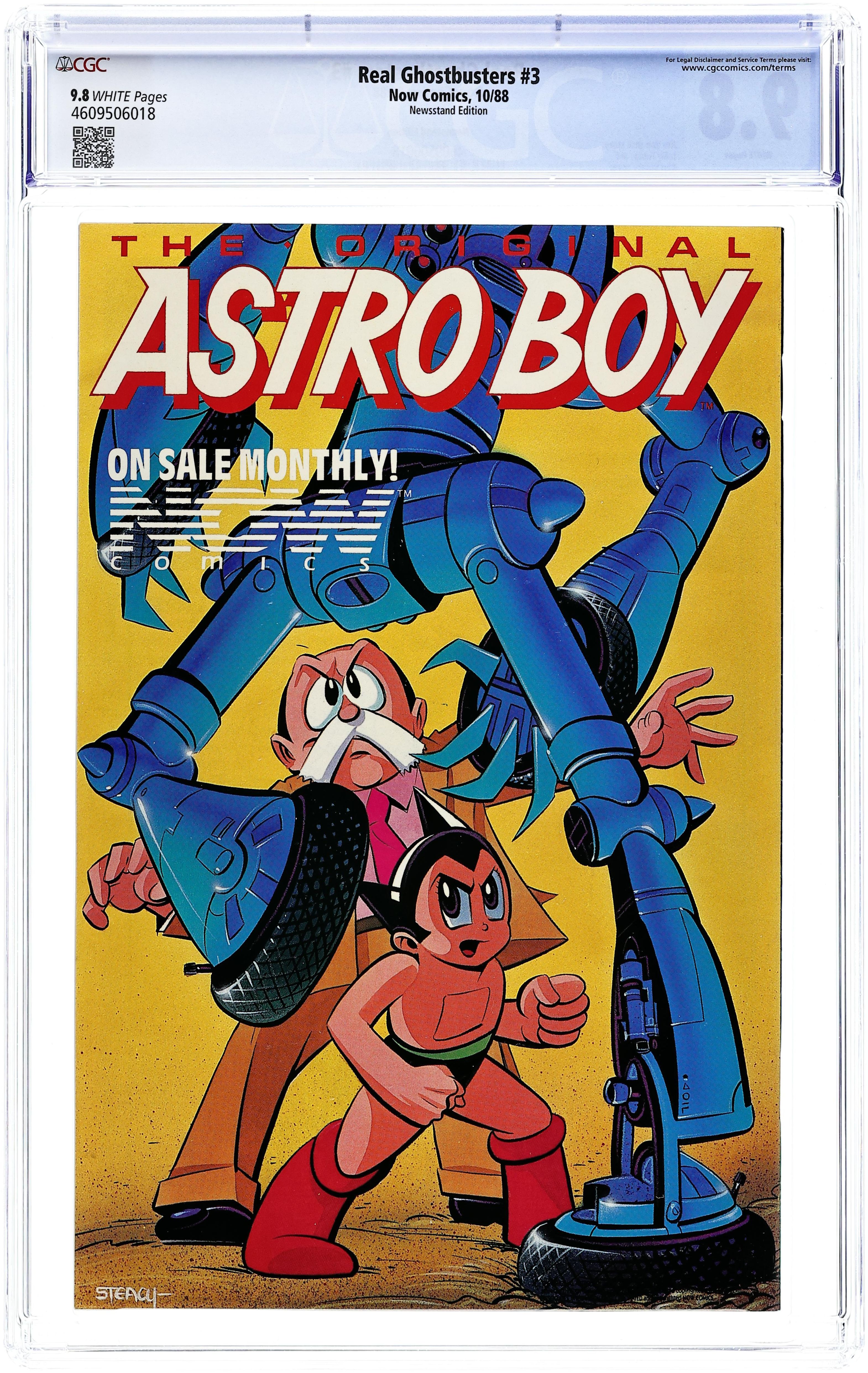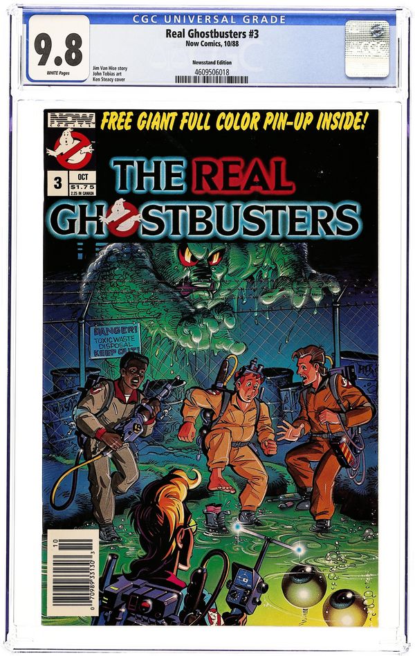 Newsstand Edition. Story by James Van Hise. Art by John Tobias, plus a pinup by Tony Akins. Cover by Andrew Pratt and Ken Steacy. The official comic adaptation of the popular 1980s cartoon series, inspired in turn by the hit movies. Toxic waste from a chemical plant creates a horde of monsters, and the Ghostbusters must decide if they have to destroy them, or if there is another solution. 32 pages, Full Color. Cover price $1.75.