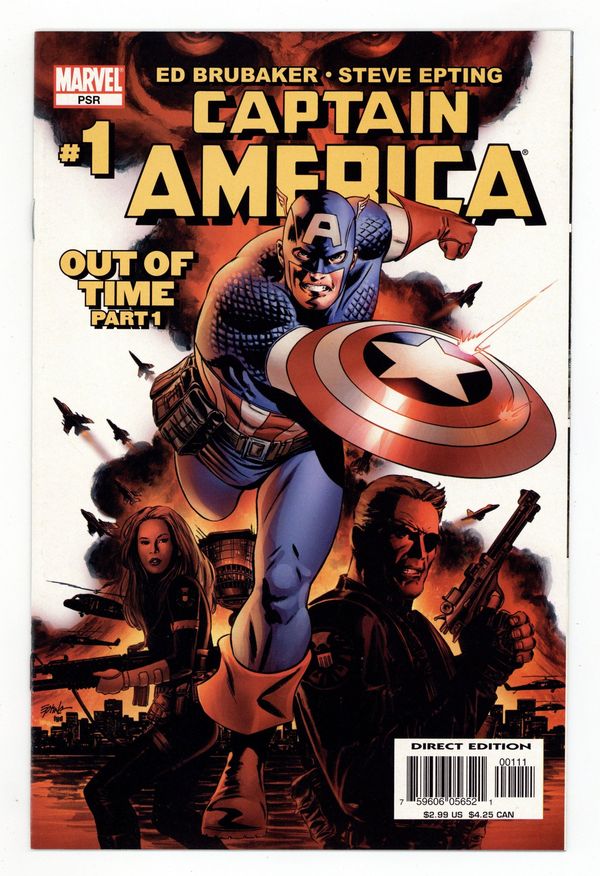 1st cameo app. of Winter Soldier. Winter Soldier: Part 1.1 - Out of Time: Part 1 of 6 - Written by ED BRUBAKER Art & Cover by STEVE EPTING It's a new beginning as four-time Eisner-nominated Best Writer Ed Brubaker makes his Marvel debut, joined by white-hot artist Steve Epting! As the new regular creative team, they will take Cap's life in directions fans will never see coming! In just this first issue, the Red Skull lays the groundwork for his most devastating attack ever on Captain America and the land he holds dear...and with the Cosmic Cube in his possession, how can Cap hope to stop him? Find out in the shocking twist-ending that will have everybody in the industry talking! 32 PGS./ MARVEL PSR NOTE: First partial/Cameo appearance of Winter Soldier. First full appearance is in issue #6 Cover price $2.99.