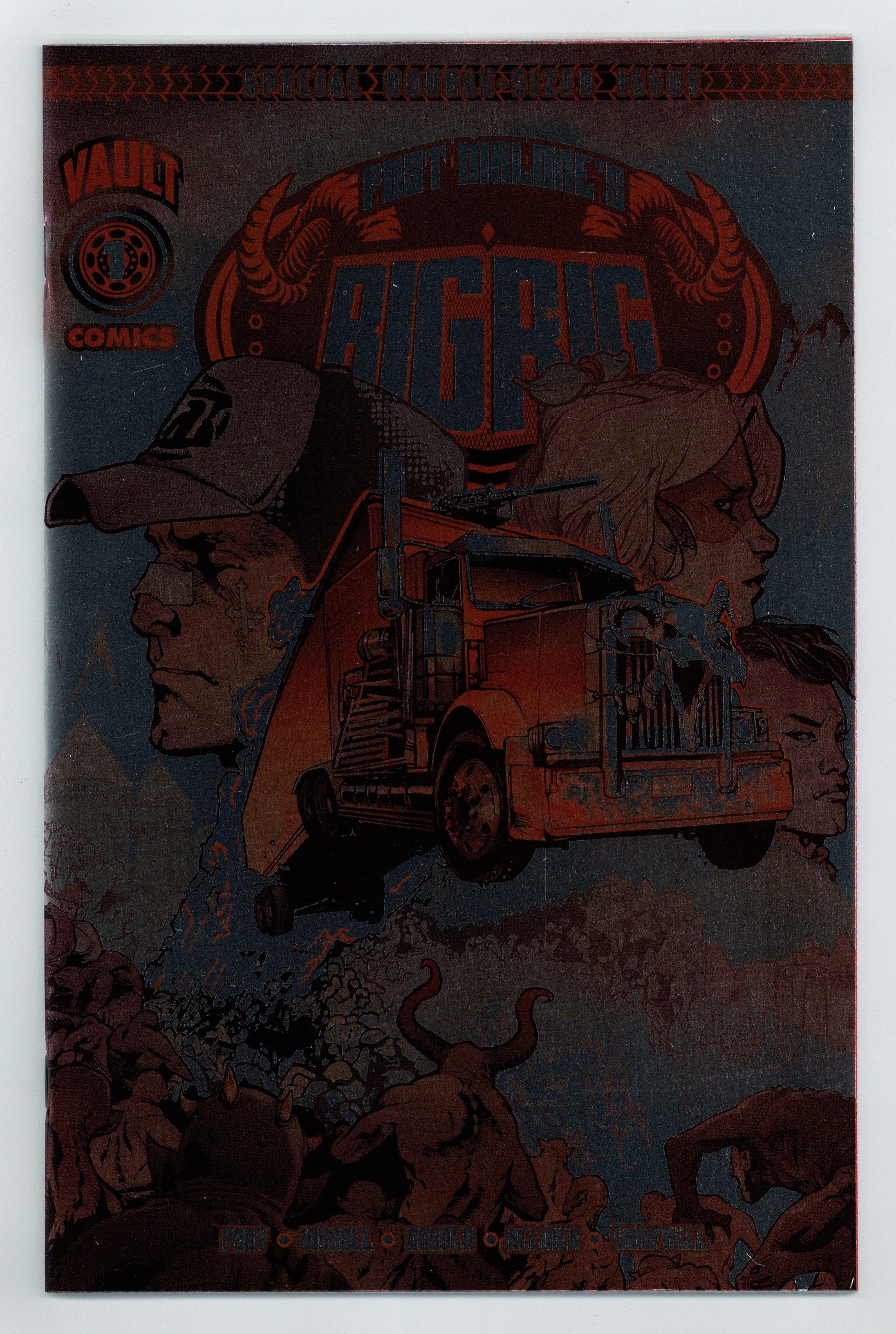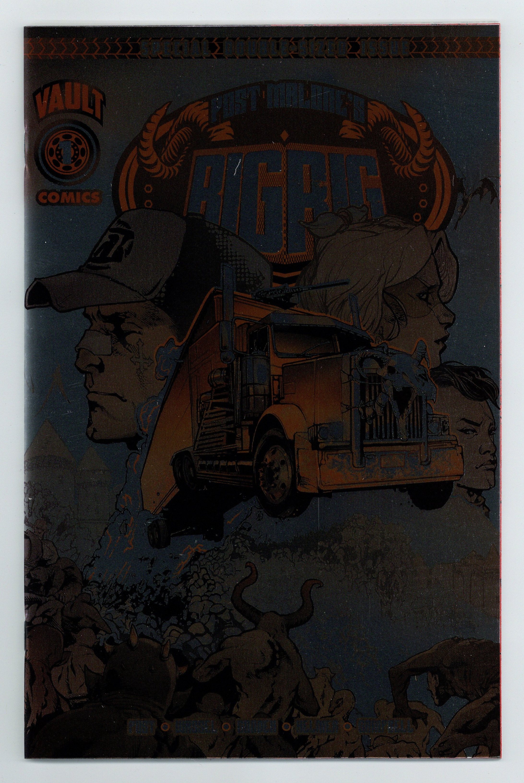 Published Aug 2025 by Vault Comics.$9.002nd Printing. Foil Edition Variant Cover by Nathan Gooden. Written by Adrian Wassel, Post Malone. Art by Nathan Gooden. Double-length — collects chapters 1 & 2! Post Malones BIG RIG. THEY PRAYED FOR A MIRACLE. THEY GOT 25 TONS AND 18 WHEELS OF HOLY WEAPON. The Dark Ages…Demon hordes plague Europe as Hell invades Earth. The Six Petals, a secret sect of The Knights Templar, are in desperate need of a means to drive back the scourge and turn the tide of the onslaught. What crashes to earth is The Rig, a fully loaded tractor trailer. In the aftermath of its arrival, the only man left standing is an enigmatic former priest excommunicated from The Six Petals. He will become Trucker and lead the fight against Hell behind the wheel of a demon-slaying machine. Created by Post Malone. Written by Post Malone and Adrian Wassel. Drawn by Barbaric co-creator and Dark Knights of Steel artist Nathan Gooden. 48 pages, PC/B&W.