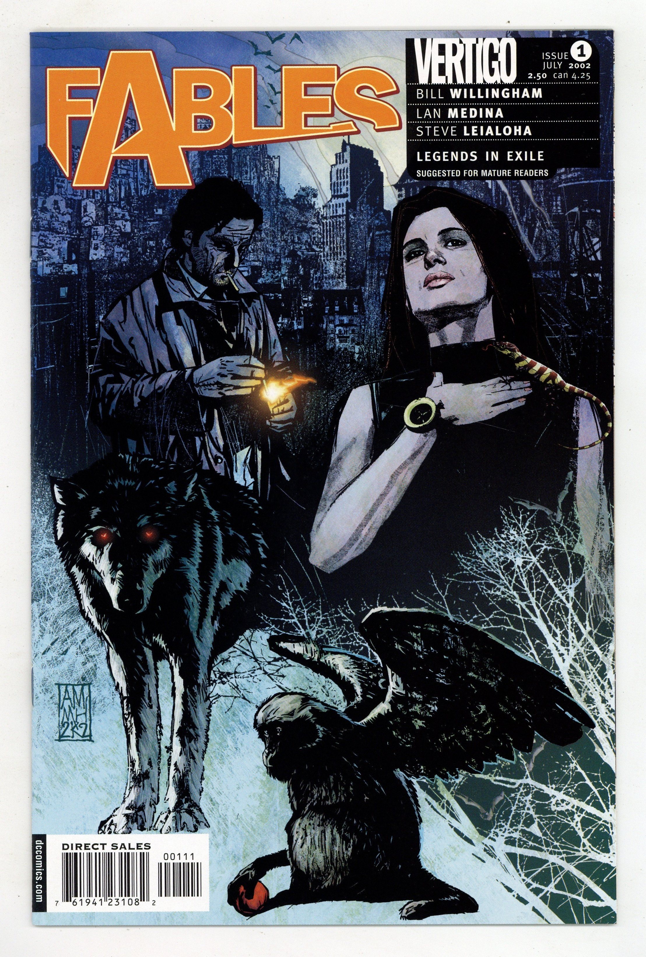 Published Jul 2002 by DC/Vertigo.$30.00WRITTEN BY BILL WILLINGHAM; ART BY LAN MEDINA AND STEVE LEIALOHA. A new VERTIGO series takes a decidedly dark spin on familiar fairy tale characters. Led by Snow White, a reformed Bigby Wolf, and a slew of others, the secret community of Fabletown is adjusting to life among the "mundanes." But this is no fairy tale, and when Snow White's estranged sister, Rose Red, goes missing ? her apartment a grizzly, bloody scene ? it's up to her sister and Mr. Wolf to find the culprit. But the question remains, will they find Rose intact, or will the cryptic message on her wall come true: "No More Happily Ever After?" MATURE READERS FC, 32 PG. Cover price $2.50.